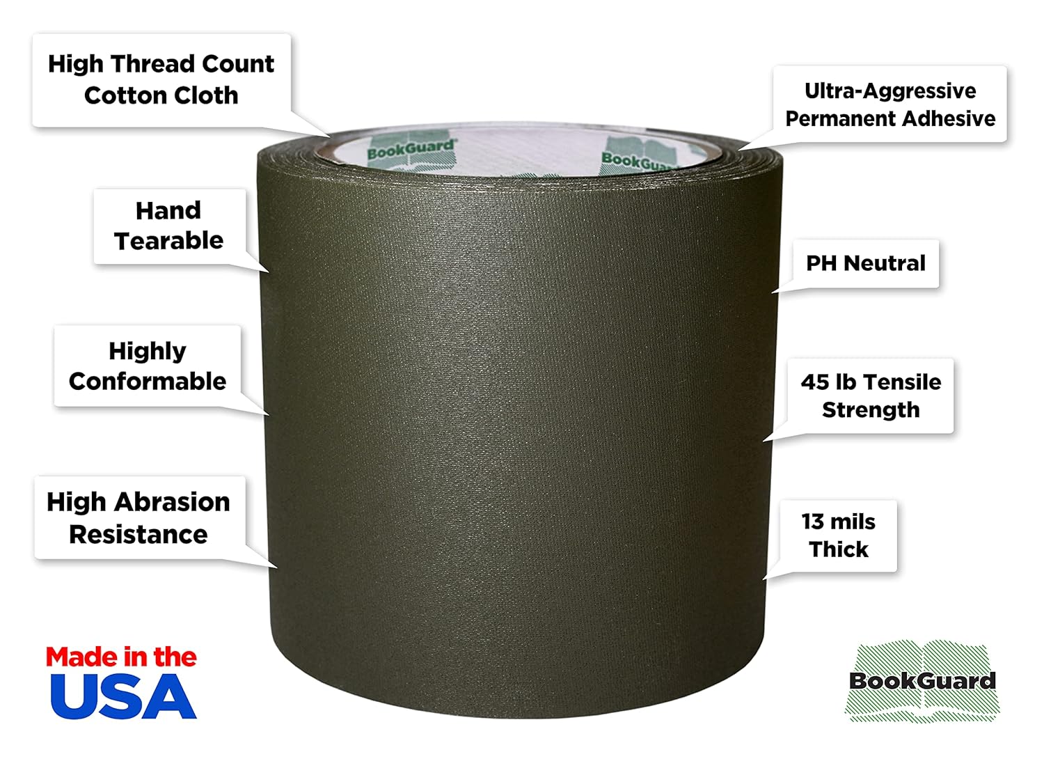 BookGuard 4 inch Premium Bookbinding Repair Cloth Tape, 15 Yard Roll, Olive