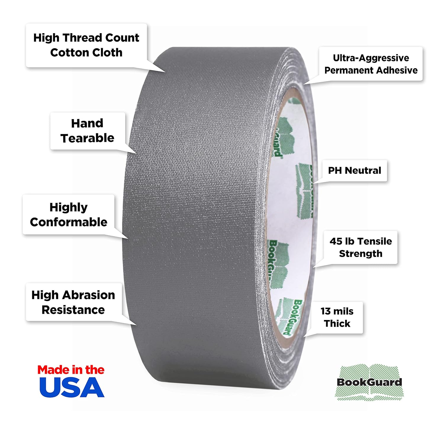 BookGuard 1-1/2 Inch Vinyl-Coated Cotton Cloth Bookbinding Repair Tape, 15 Yard Roll, Gray