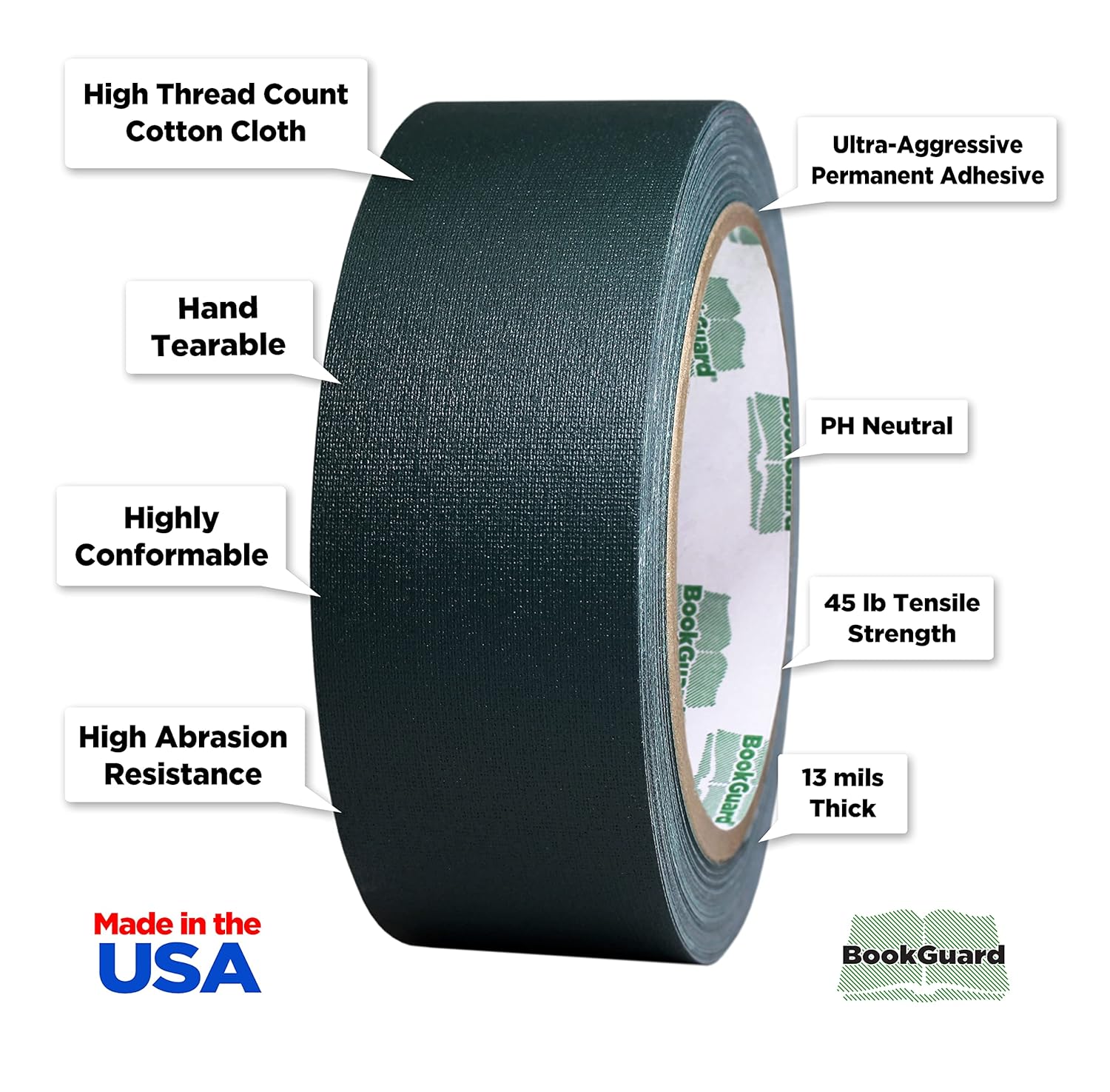 BookGuard 1-1/2 Inch Vinyl-Coated Cotton Cloth Bookbinding Repair Tape, 15 Yard Roll, Forest Green