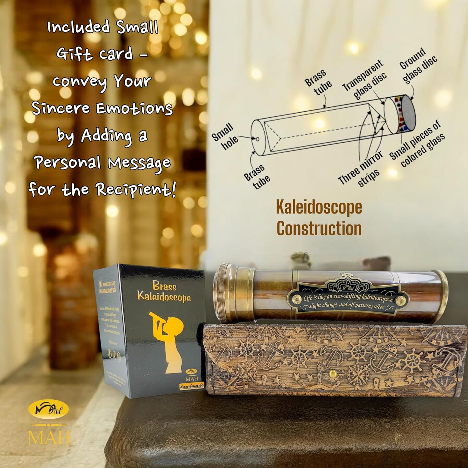 - π A Thoughtful Gift with Meaning: Handcrafted solid brass kaleidoscope featuring the engraved quote βLife is like an ever-shifting kaleidoscope β a slight change, and all patterns alter.β A sentimental keepsake that makes a memorable gift for kids, teens, and adults alike.
