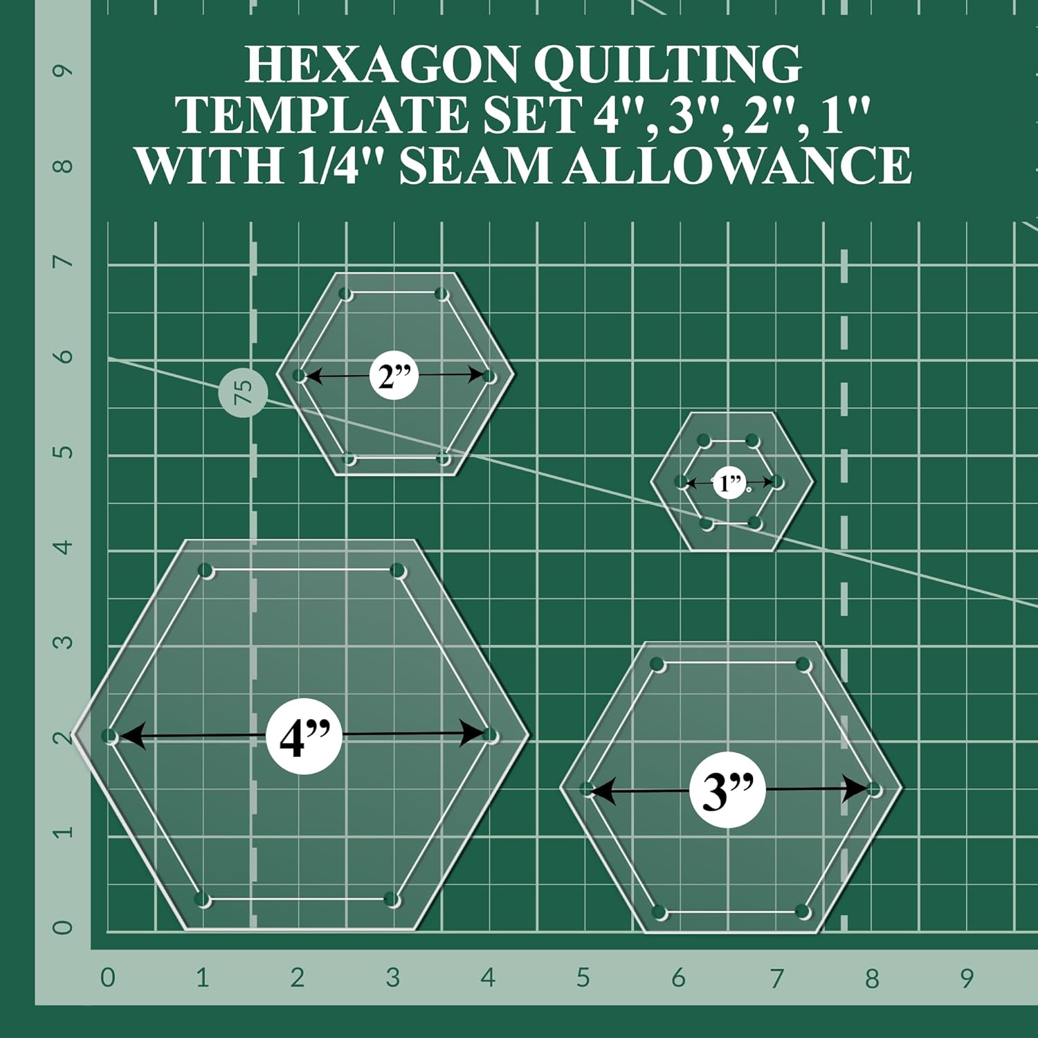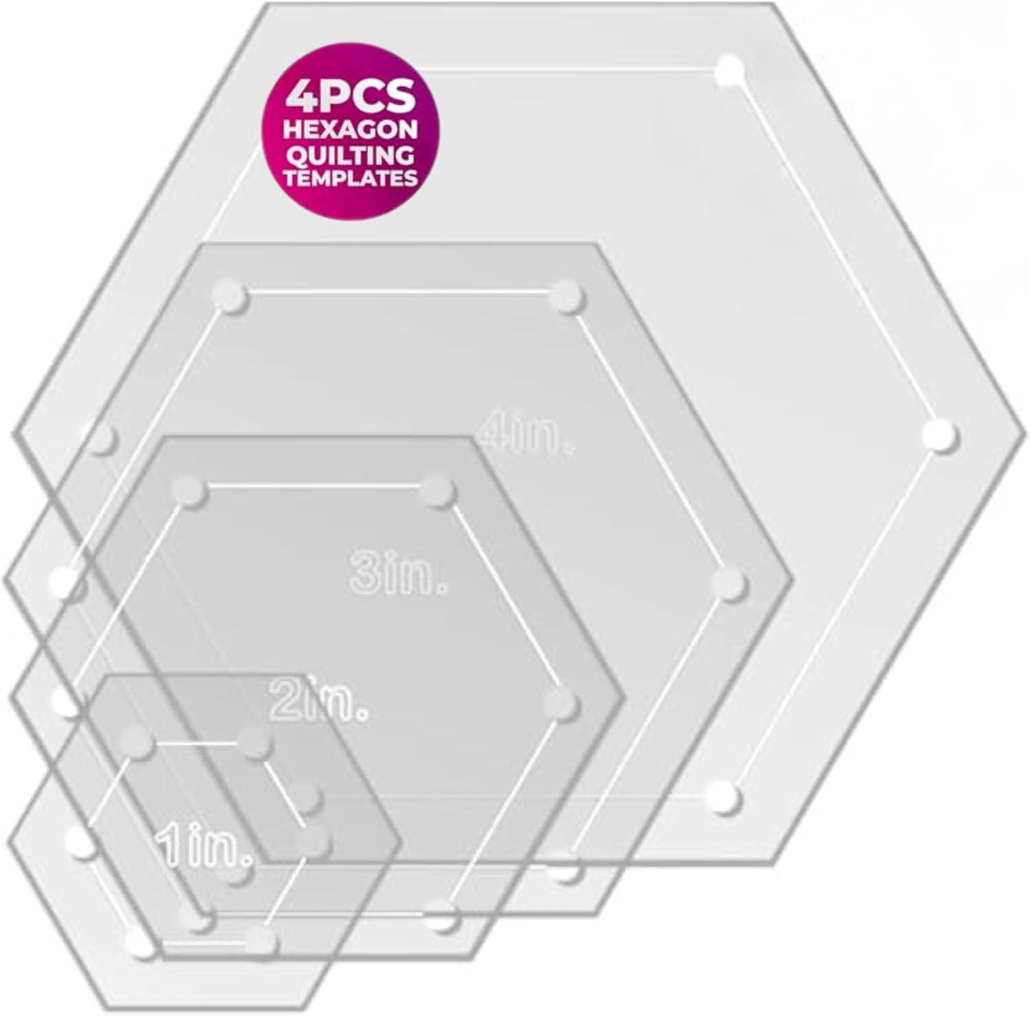 Hexagon Quilting Template Set - 4", 3", 2", 1" Sizes with 1/4" Seam Allowance - Durable Acrylic Templates for Quilting, Patchwork, Crafting, & Sewing Projects - Clear Templates for Accuracy