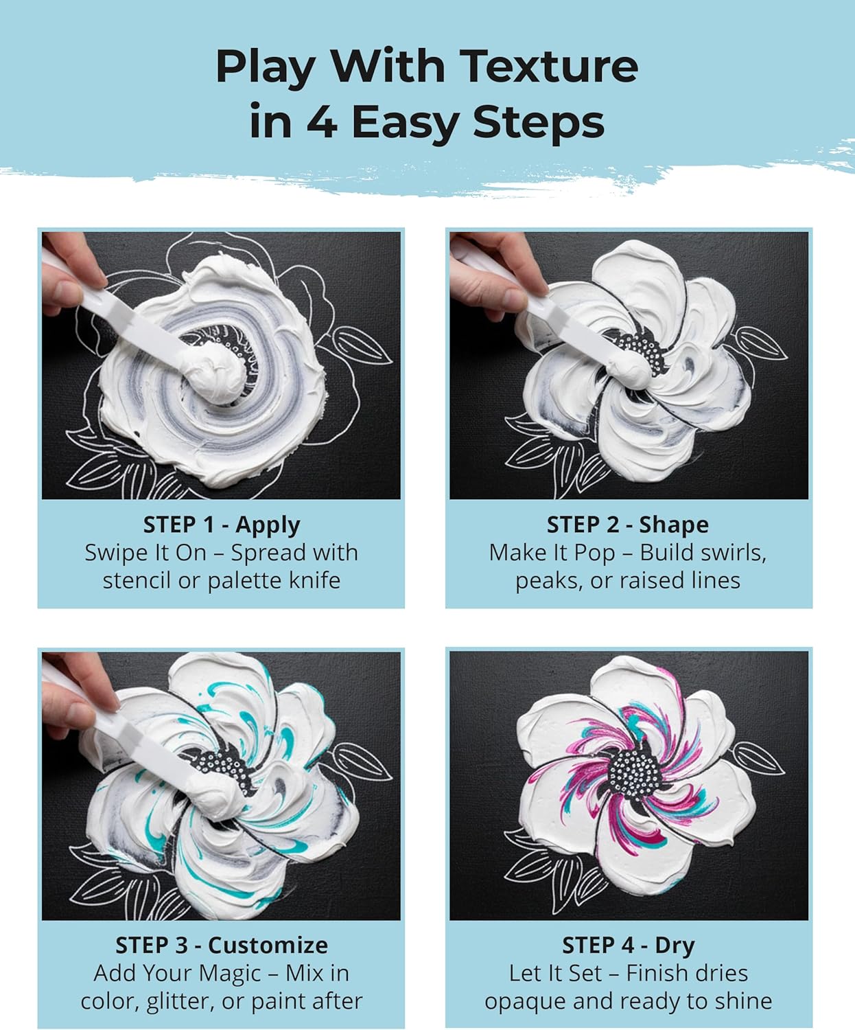 - AIRY TEXTURE, DEFINED RESULTS - Dries dimensional and fluffy with a light whipped texture that holds peaks and volume. Great for sculpting snow, Santa’s beard, fluffy clouds and other raised details without cracking or flaking. Add glitter or sand for some sparkle. Perfect for DIY cards of all kinds