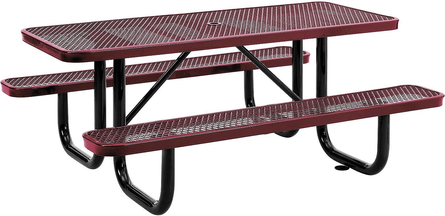 Global Industrial 6’L Rectangular Picnic Table, Expanded Metal, Red Thermoplastic Coating, Attached Benches, 1-1/2” Umbrella Pole Hole, Outdoor-Rated, 1000 lb Capacity, 72” x 30” Tabletop