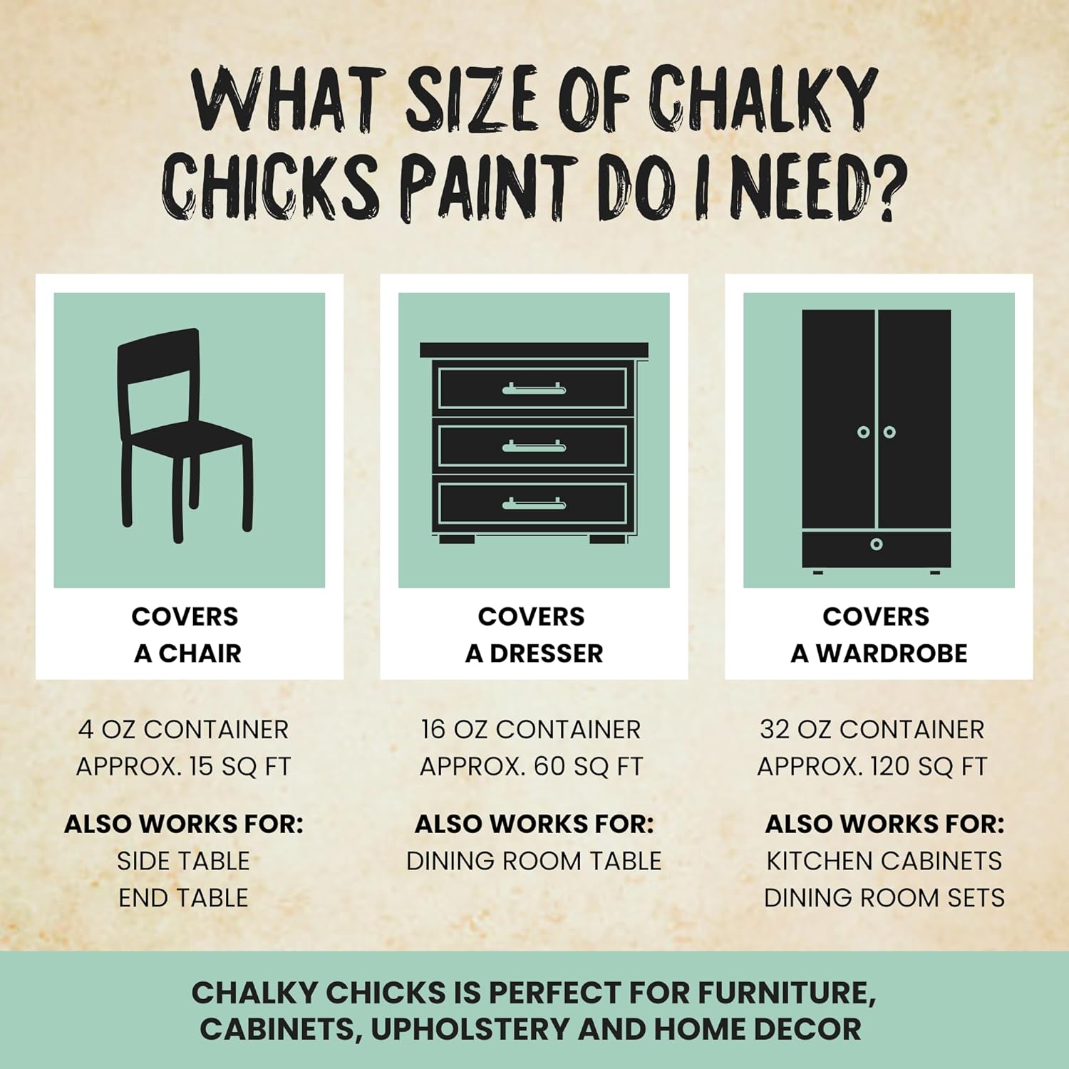 - TRANSFORM FURNITURE AND HOME DECOR WITH EASE: Chalky Chicks will save you time, money, and hassle. No sanding, priming, or multiple coats needed—just start painting your furniture with our cabinet paint no sanding or priming. Our paint is suitable for wood, metal, concrete, textiles, laminate, and more. Whether you prefer navy blue chalk paint, light blue paint, or green chalk paint, our chalk paint for furniture transforms any space with ease, making it ideal for DIY projects & craft painting.