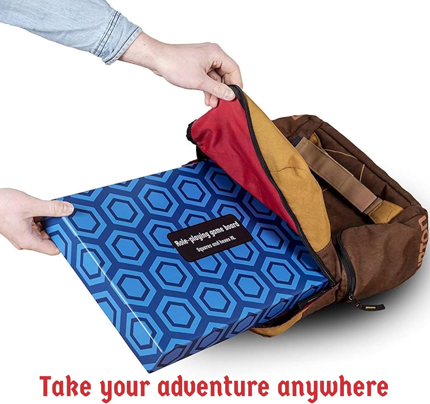 - Easy Transport and Storage: The board is foldable and measures 17''x11''x0.75'' fully folded. The box measures 17.25''x11.25''x 2'' and can easily fit in a backpack. This leaves some empty space in the provided box that can be filled with dice, miniatures, map tiles, rules, sheets and markers. The drawings can be left on the board when folding. This is convenient for multiple gaming sessions requiring the same terrain. The dry erasable lines can be erased and redrawn for a new adventure.