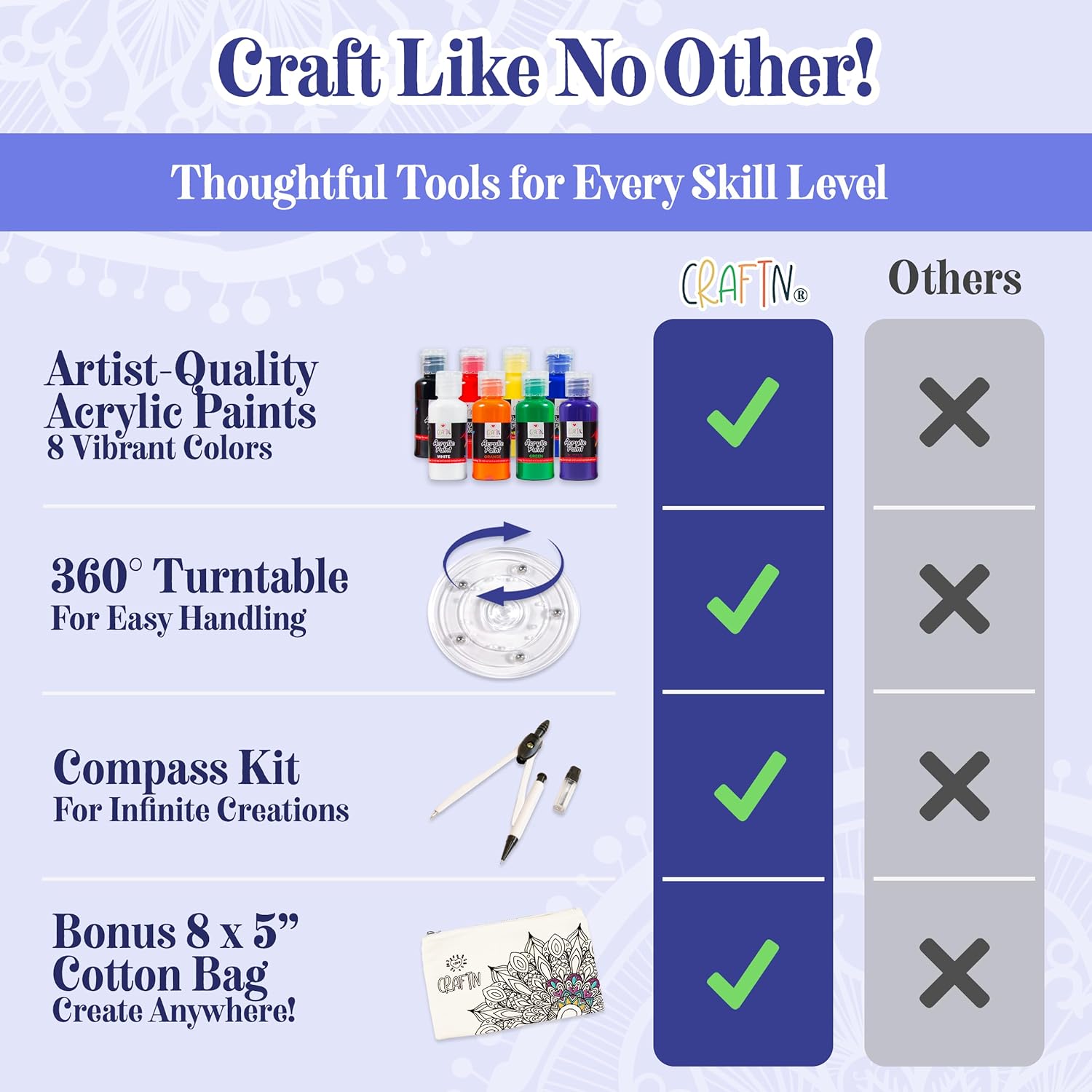 - FEATURING ARTIST GRADE PAINTS. Our all-in-one bundle kit is designed for you to create stunning mandala art patterns effortlessly. Inside, you'll find professional-grade paints in eight eye-catching colors to ignite your creativity. Unleash your imagination further by mixing these vibrant hues to achieve any colorful combinations you envision.