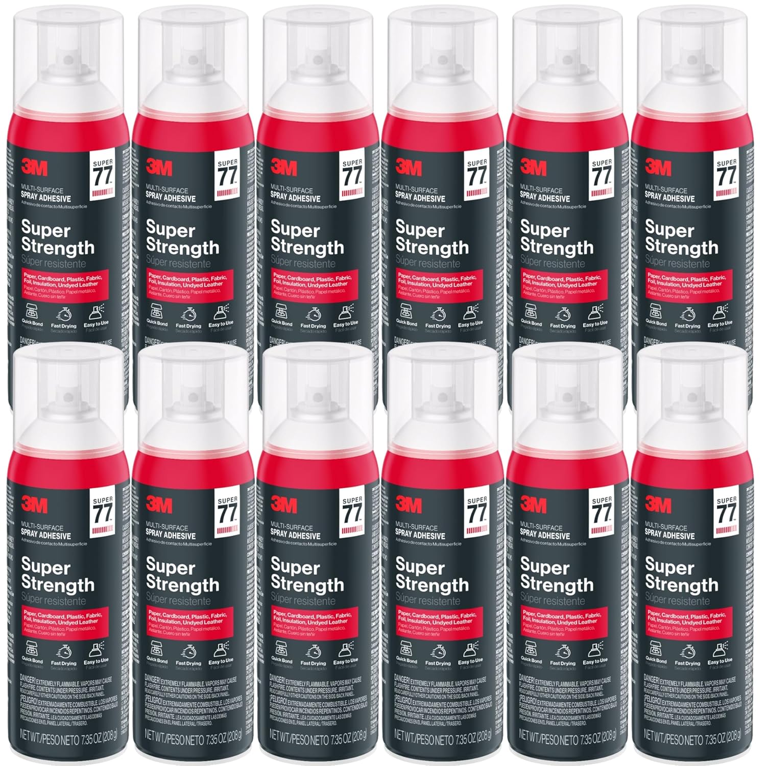 3M Super 77 Multipurpose Spray Adhesive, 7.35 oz Cans, Pack of 12 – Bulk High-Strength Spray Glue for Foam, Fabric, Plastic, Paper, Cardboard, Metal & More