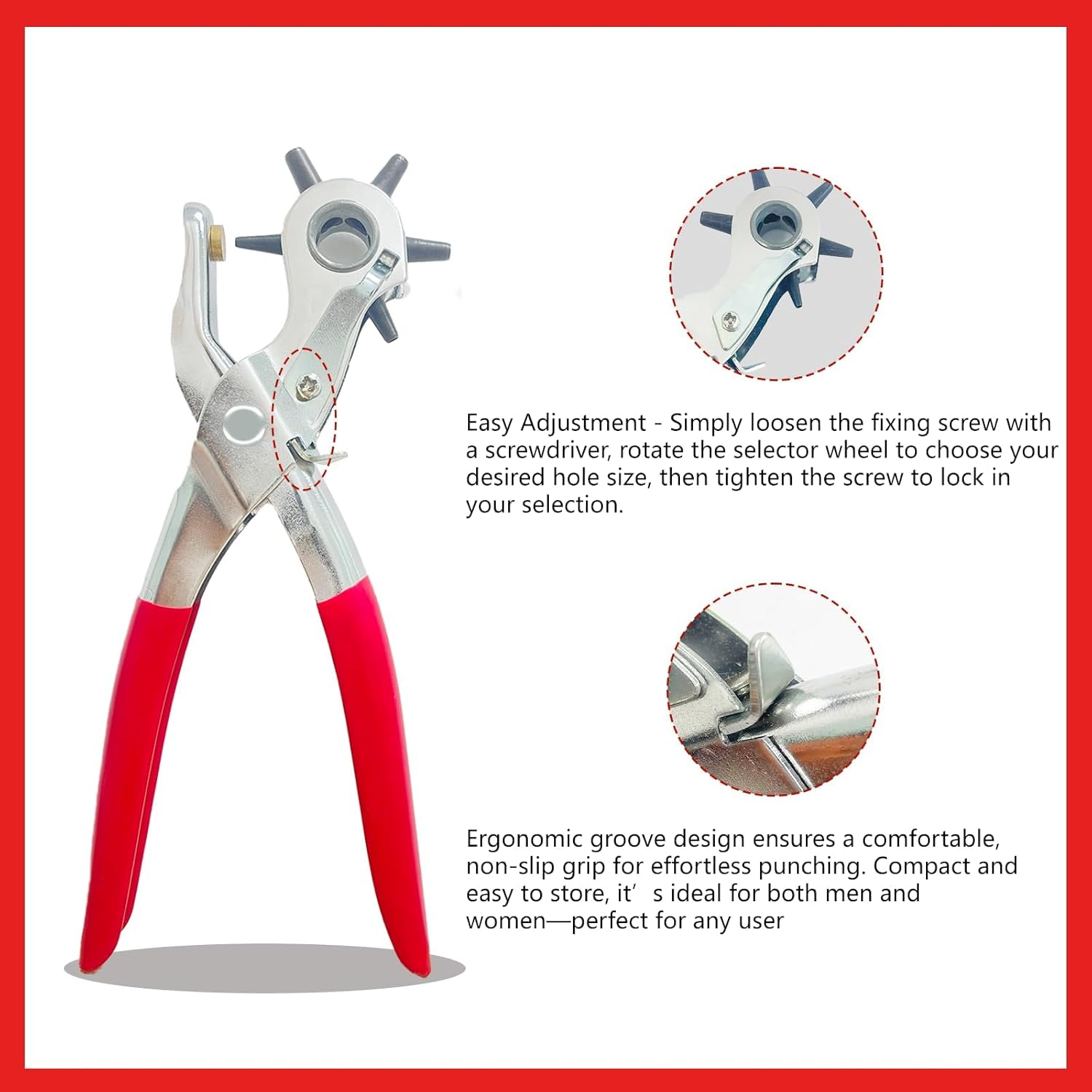 - 【6 Adjustable Hole Sizes】 This belt hole puncher features 6 different punch sizes, making it perfect for belts, leather, shoe straps, fabric, and DIY crafts. Achieve precise and clean holes with ease!