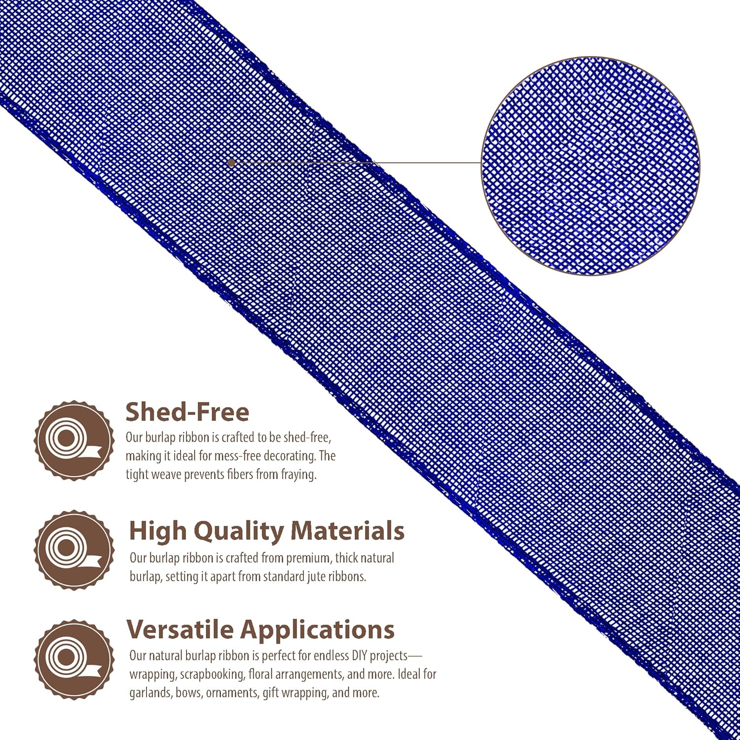 - Natural Burlap Ribbon: Compared to other jute burlap ribbons, our rustic burlaps ribbon with a fray & shed-resistant hemmed edges is made from thicker royal blue burlap fabric. The indoor & outdoor colored burlap crafts ribbon is colorfast and will not bleed.