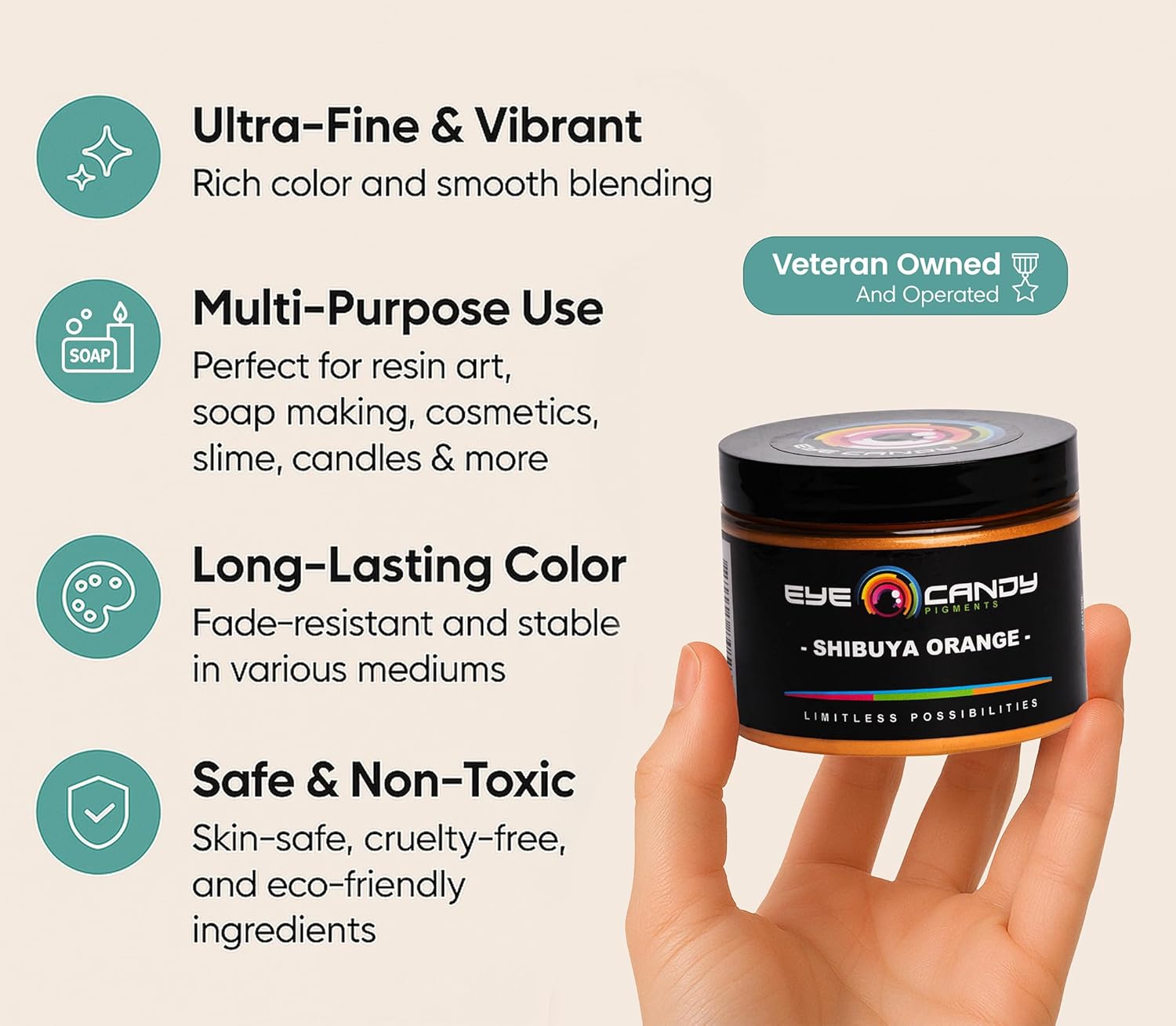 - MULTIPURPOSE ORANGE MICA POWDER – Embrace the vibrant Shibuya Orange, a magical warm hue that captivates. Perfect for artists and crafters using epoxy resin, creating unique jewelry, or making homemade slime and bath bombs. It's ideal for acrylic painting, melt & pour soap projects, enriching plastics, and candle making. Add a touch of warmth and radiance to your creations with this enchanting color.