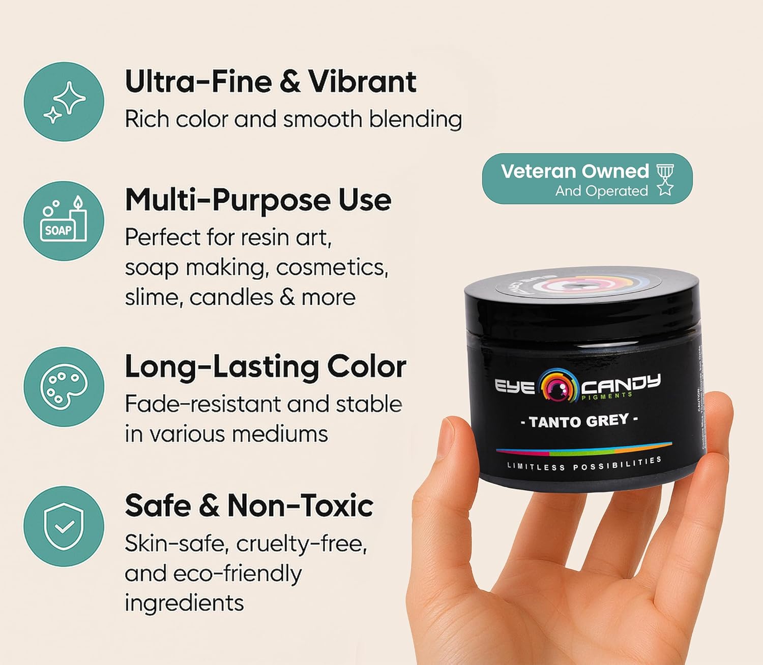 - MULTIPURPOSE GREY MICA POWDER – Tanto Grey unveils a stunning light luster grey, perfect for a variety of creative pursuits. Ideal for epoxy resin projects, it adds a subtle sheen to acrylic paintings, slime, and bath bombs. Craft elegant jewelry, incorporate into melt & pour soap, and use in candle making for a touch of sophistication. This pigment also works wonderfully in coloring plastics, making Tanto Grey a versatile choice for any artistic need.