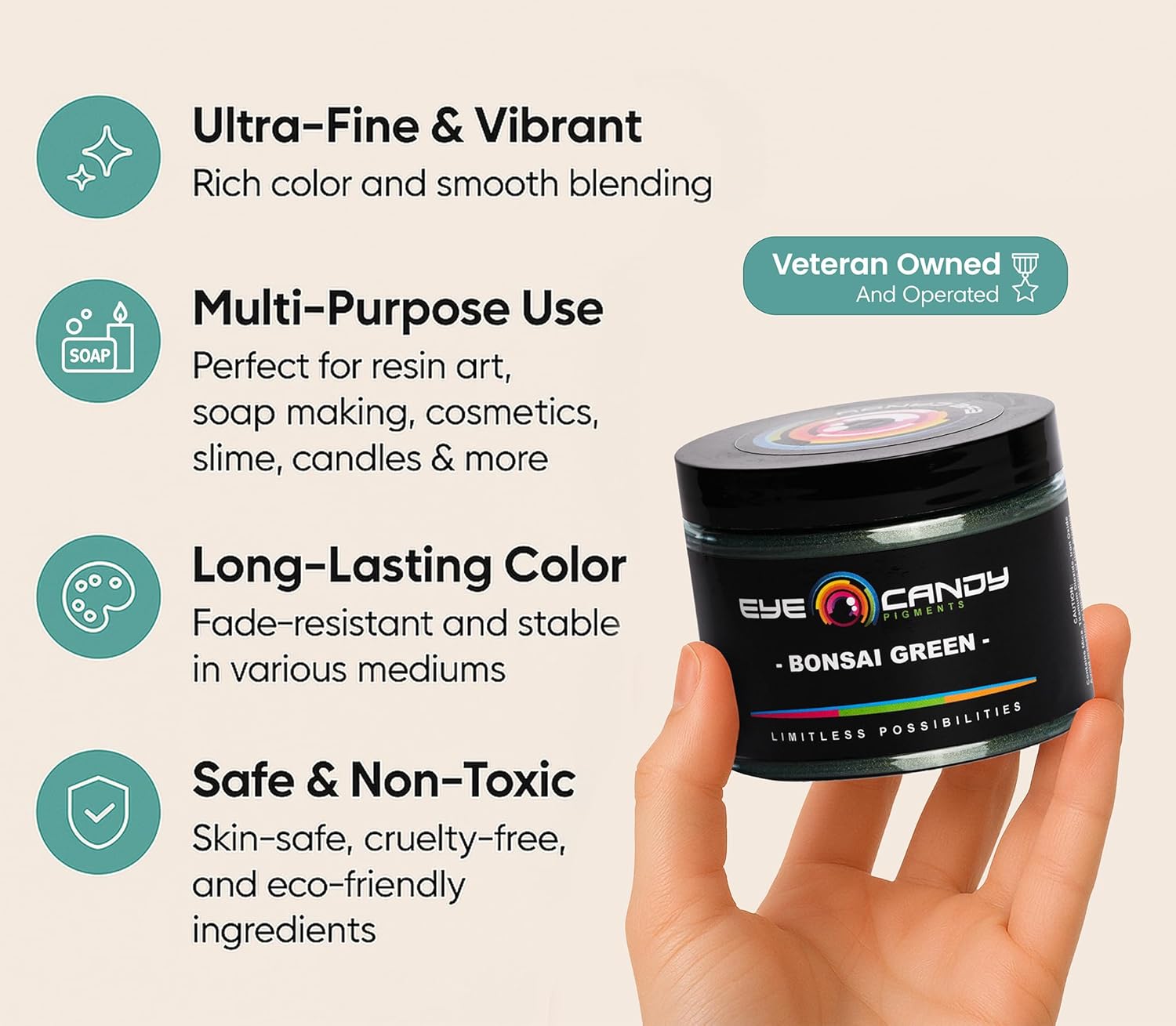 Eye Candy Pigments Premium Green Mica Powder - Bonsai Green (50gr) - for Epoxy, Resin, Soap, Paint, Woodworking, Acrylic Pouring, Bath Bombs, Fishing Lures - DIY Arts and Crafts Additive