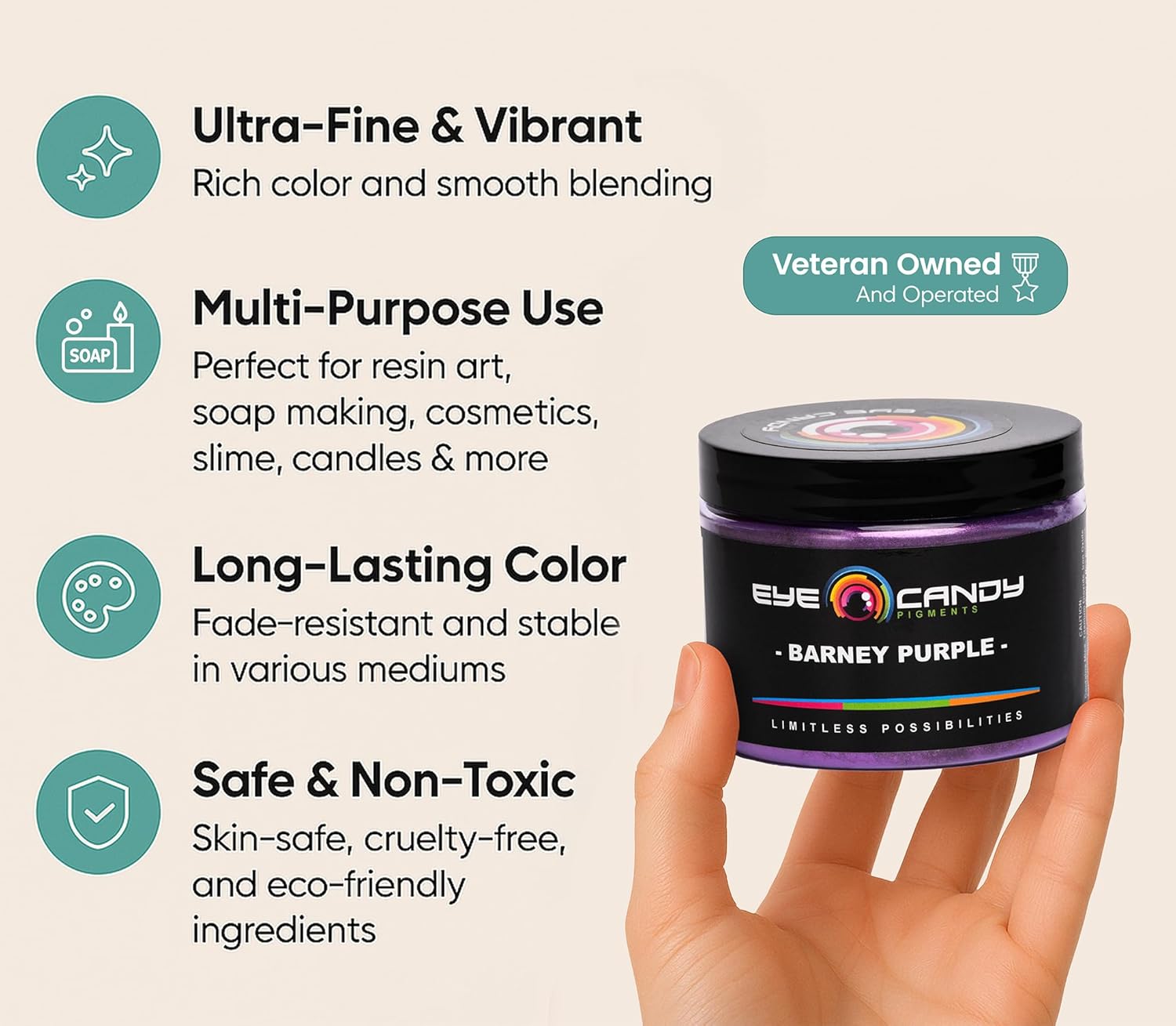 - MULTIPURPOSE PURPLE MICA POWDER – Dive into the mesmerizing depth of our Barney Purple, a pure and captivating purple pigment. This shade embodies the essence of regal beauty, ensuring every creation stands out with undeniable elegance. Whether you're crafting or creating, this pigment is your ticket to stunning results. Perfect for epoxy resin, melt & pour, plastics, acrylic painting, slime, bath bombs, jewelry, and candle making.