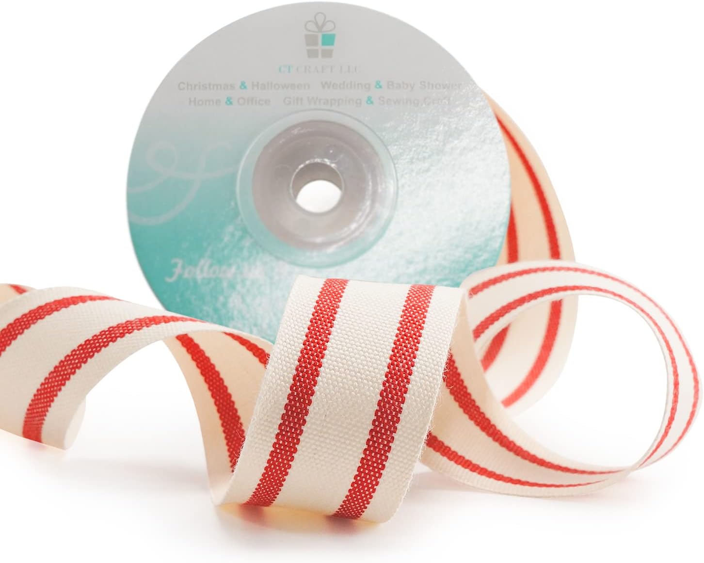 CT CRAFT LLC Ivory Cotton Red Stripes Ribbon 1" x 10 Yards for Home Décor Gift Present Wrapping DIY Crafts Birthday Wedding Bouquet Christmas