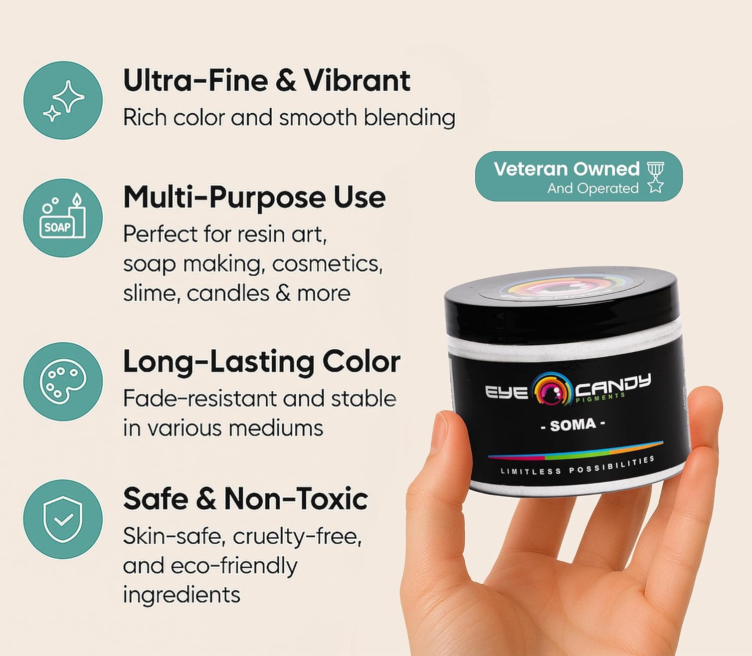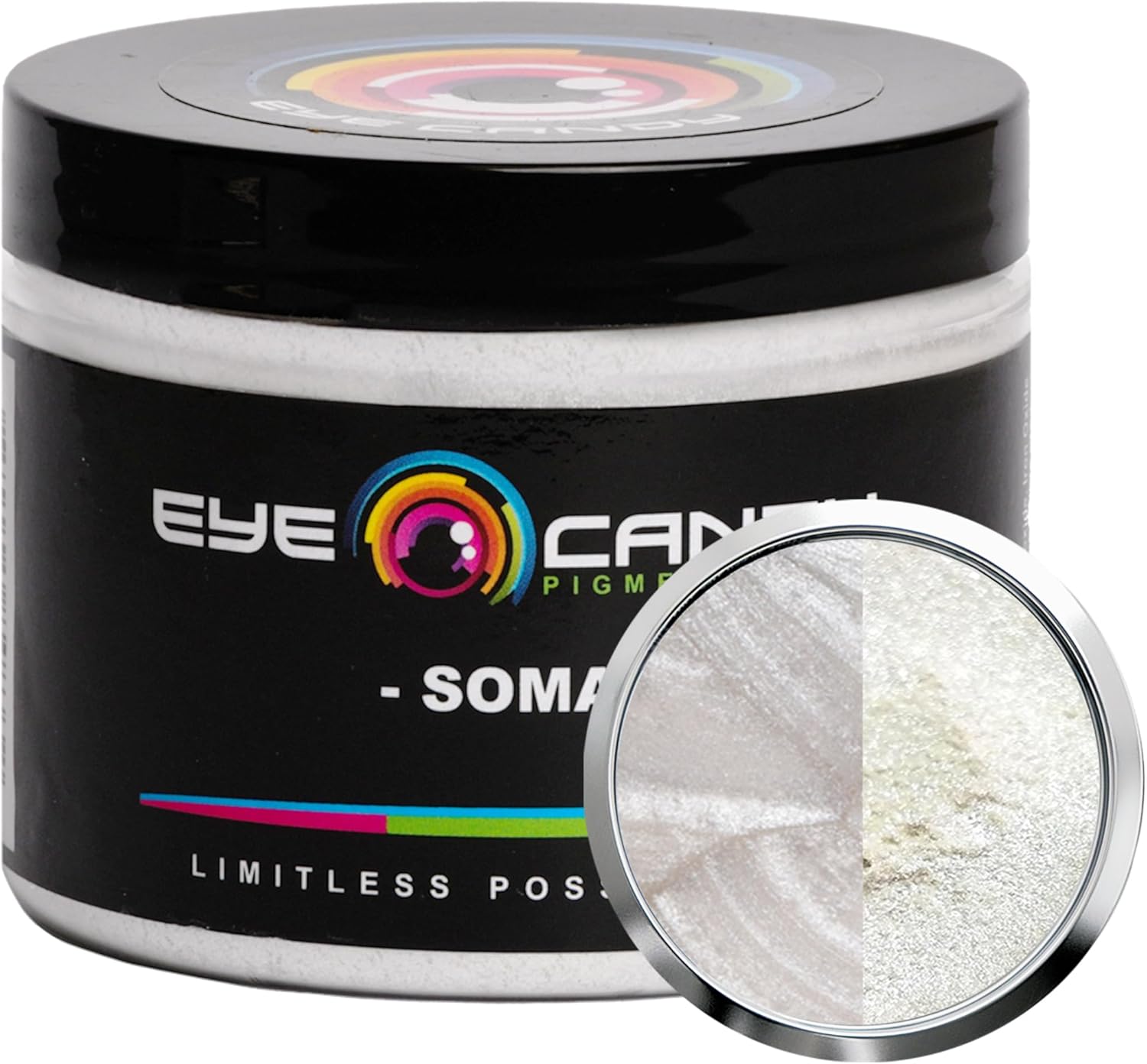 - MULTIPURPOSE WHITE MICA POWDER – Elevate projects with Soma White—a fusion of silver & white. Ideal for acrylic painting, slime, bath bombs, jewelry crafting, melt & pour, plastics, screen printing, and candle making. A concentrated shimmer for diverse applications. Safe, eco-friendly & blendable. Dive into metallic magic with Soma White!