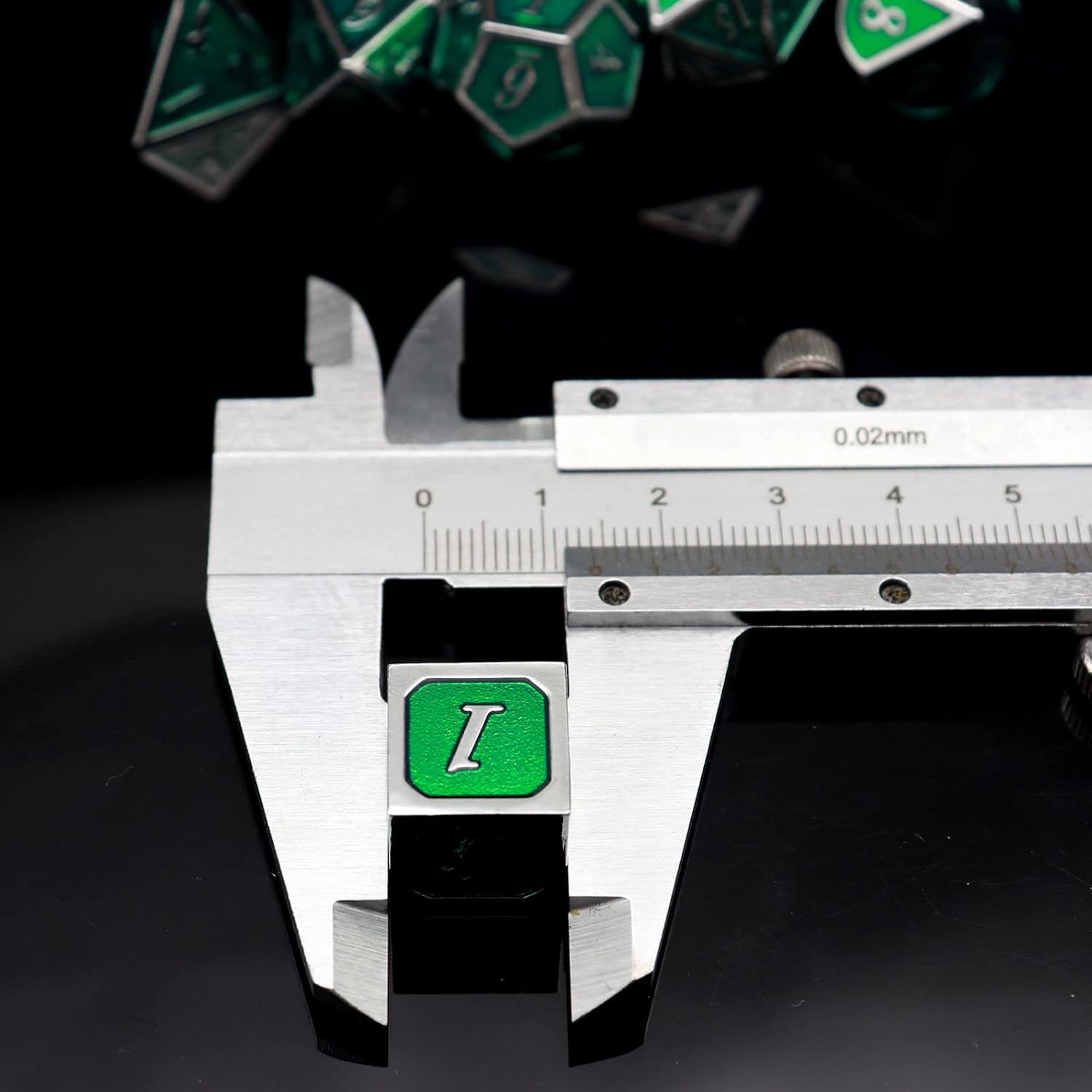 - Green Metal DND Dice Set: 7pcs metal dice silver emerald green for role playing games: D20, D12, D10, D100, D8, D6, D4