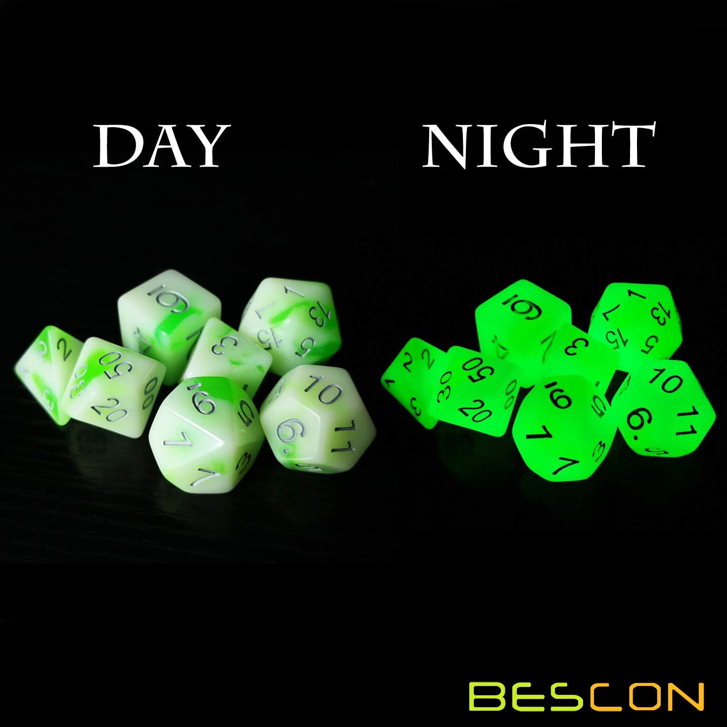 Bescon Glowing Polyhedral RPG Dice Set Luminous Jade, Bescon Glow in Dark Poly Dice Set of 7, DND Role Playing Game Dice