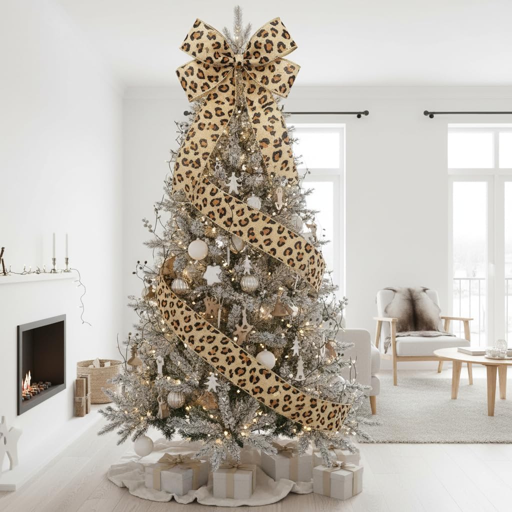 CT CRAFT LLC Burlap Leopard Fabric Wired Ribbon 2.5" x 10 Yards Natural with Black and Bronze Color for Christmas Home Wedding Decor Gift Wrapping Tree Topper Bow Wreath Bouquet DIY Crafts
