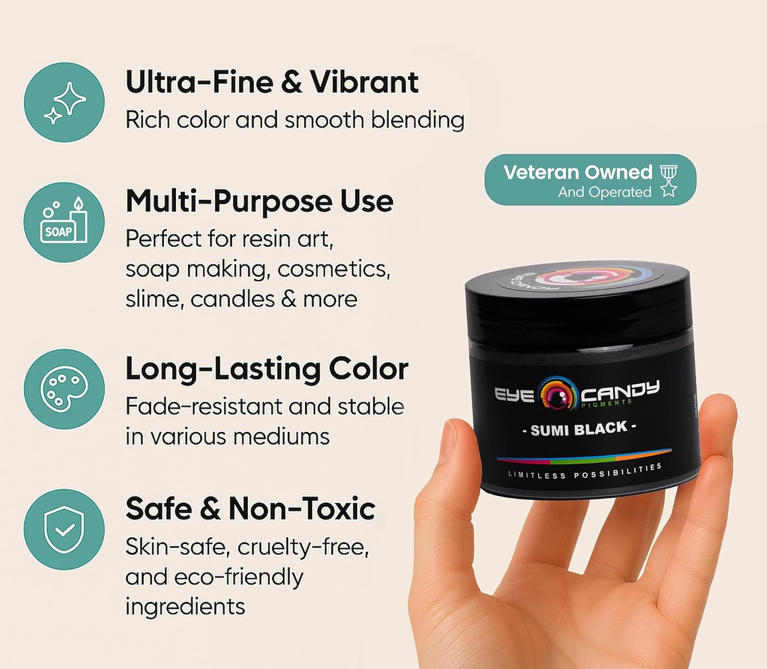 - MULTIPURPOSE BLACK MICA POWDER – Delve into the rich intensity of Sumi Black, one of our darkest shades, characterized by its pearl-black hue. Whether crafting bold jewelry or creating immersive art, this pigment promises unparalleled depth. Tailored for a range of applications including epoxy resin, acrylic painting, jewelry projects, and more. Also ideal for slime, bath bombs, melt & pour, plastics, and candle making. Explore deeper with Sumi Black.
