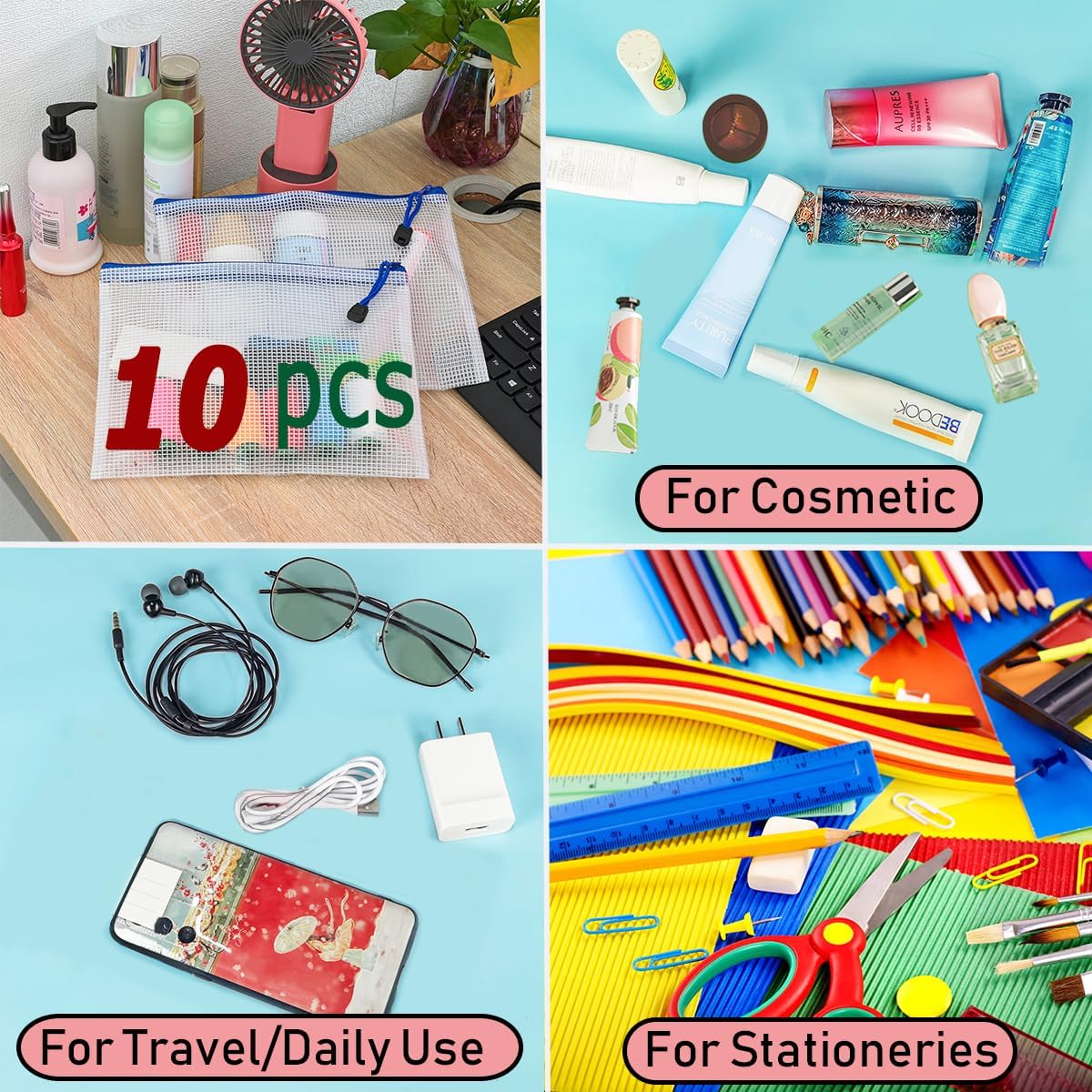 - 10 PCS Plastic mesh zipper bags, 9.2 x 6.7 inch A5 size. Widely used in office supplies, school, home daily life, hospital and travel. These pouches could meet your needs in all ways