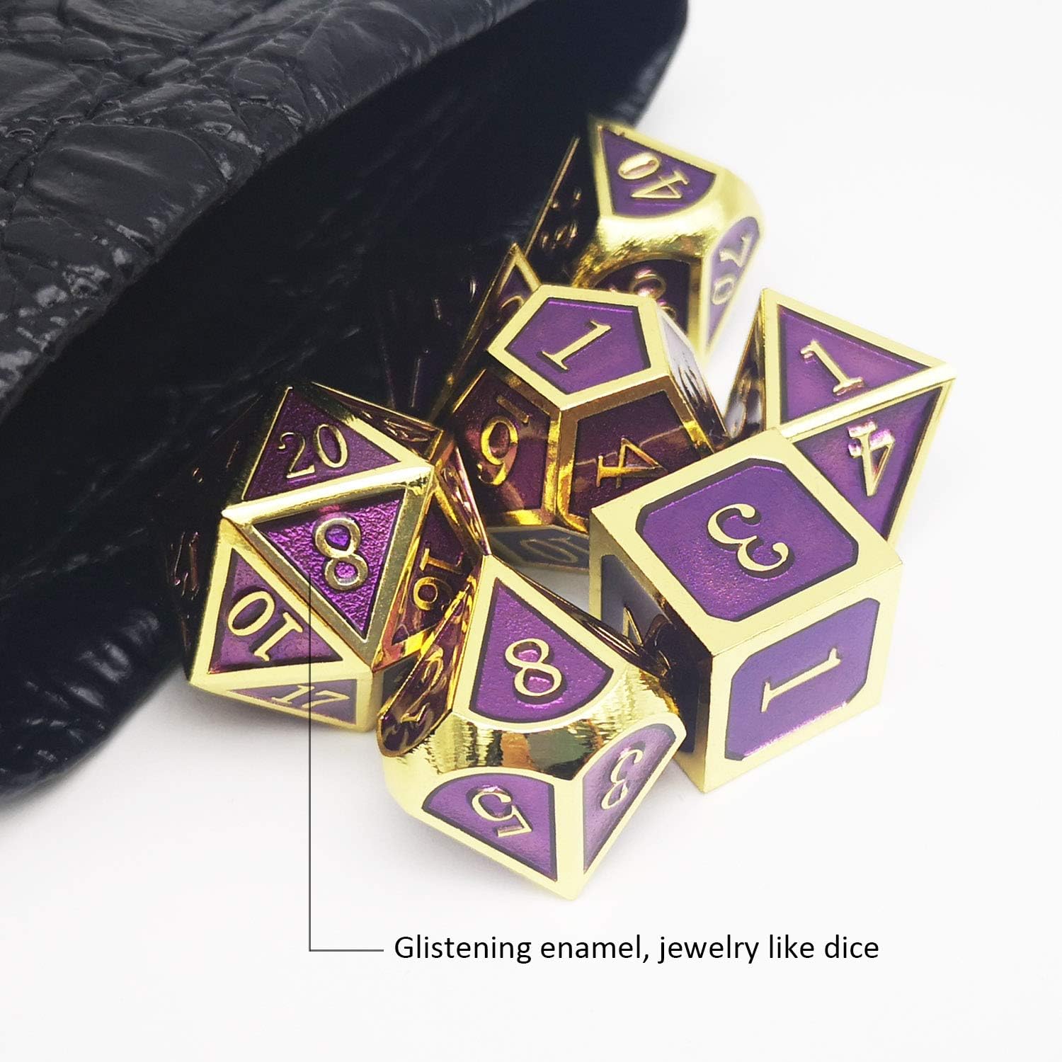 - Metal DND Dice Set Gold Purple- 7PCS Dice: 1xD20, 1xD12, 2xD10(one 00-90, one 0-9), 1xD8, 1xD6, 1xD4; 1xPU Dice Bag