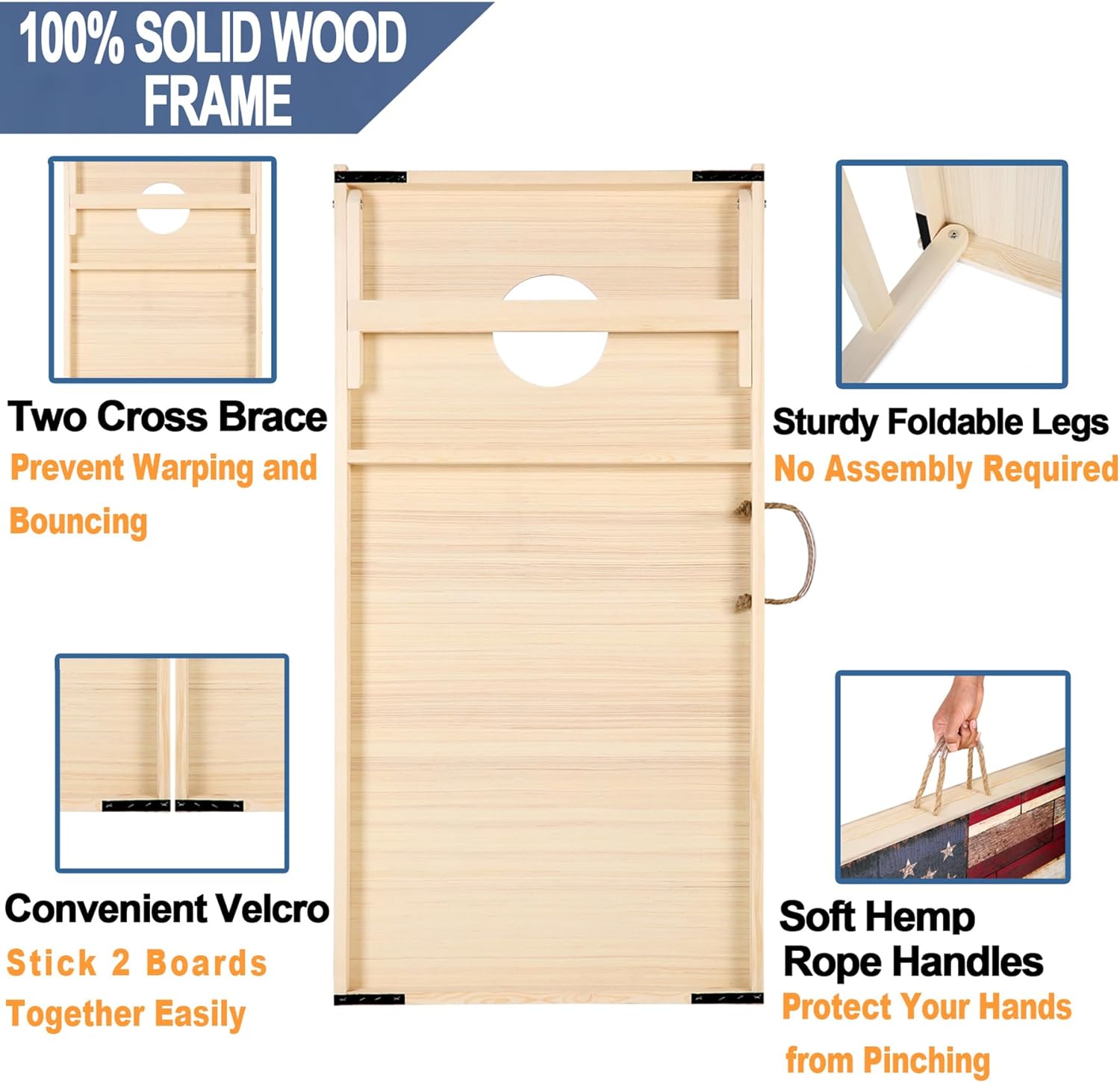 - THICKER SOLID WOOD CONSTRUCTION: This cornhole set is made of 100% thicker solid wood frame, itโs stronger enough and more stable. Extra cross brace on the back of the boards, strengthens the construction to prevent warping and bouncing effectively. Top-of-the-line cornhole boards for long-lasting fun!