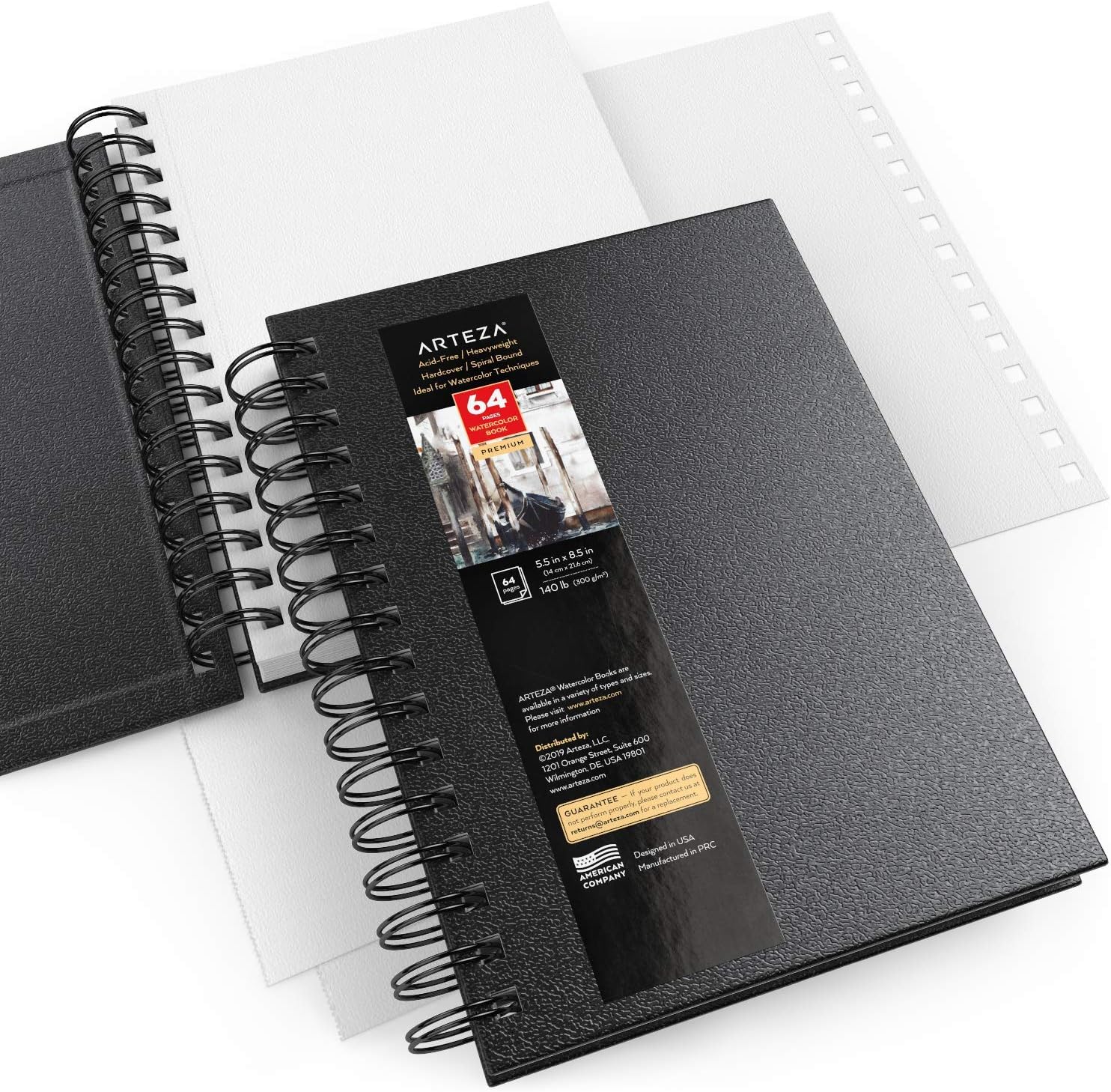 ARTEZA Watercolor Sketchbook Set, 3-Pack, 64 Pages per Book, 5.5 x 8.5 Inches, Black Hardcover Spiral Notebooks, 140-Pound Premium Watercolor Paper for Artists