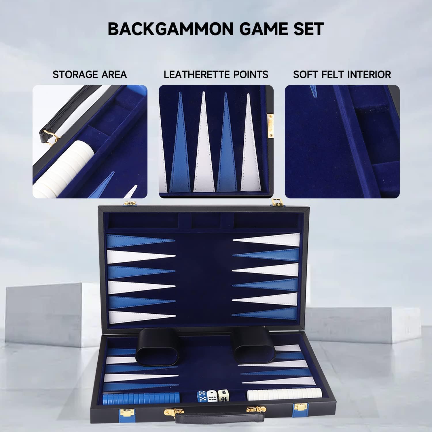 - Premium Material: The leather backgammon game set is made from black leatherette material with two blue stripes on the outside, the interior is made of soft felt interior with leatherette points; the blue and white triangular points are made of the same leatherette material as the outside, and they are stitched to the playing surface