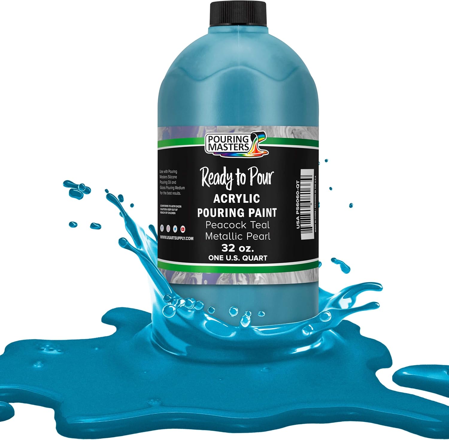 Pouring Masters Peacock Teal Metallic Iridescent Pearl Ready to Pour Acrylic Pouring Paint - Premium 32-Ounce Pre-Mixed Fluid Acrylic Paint - Fluid Art Supplies for Canvas, Wood, Paper, Tile & Rocks