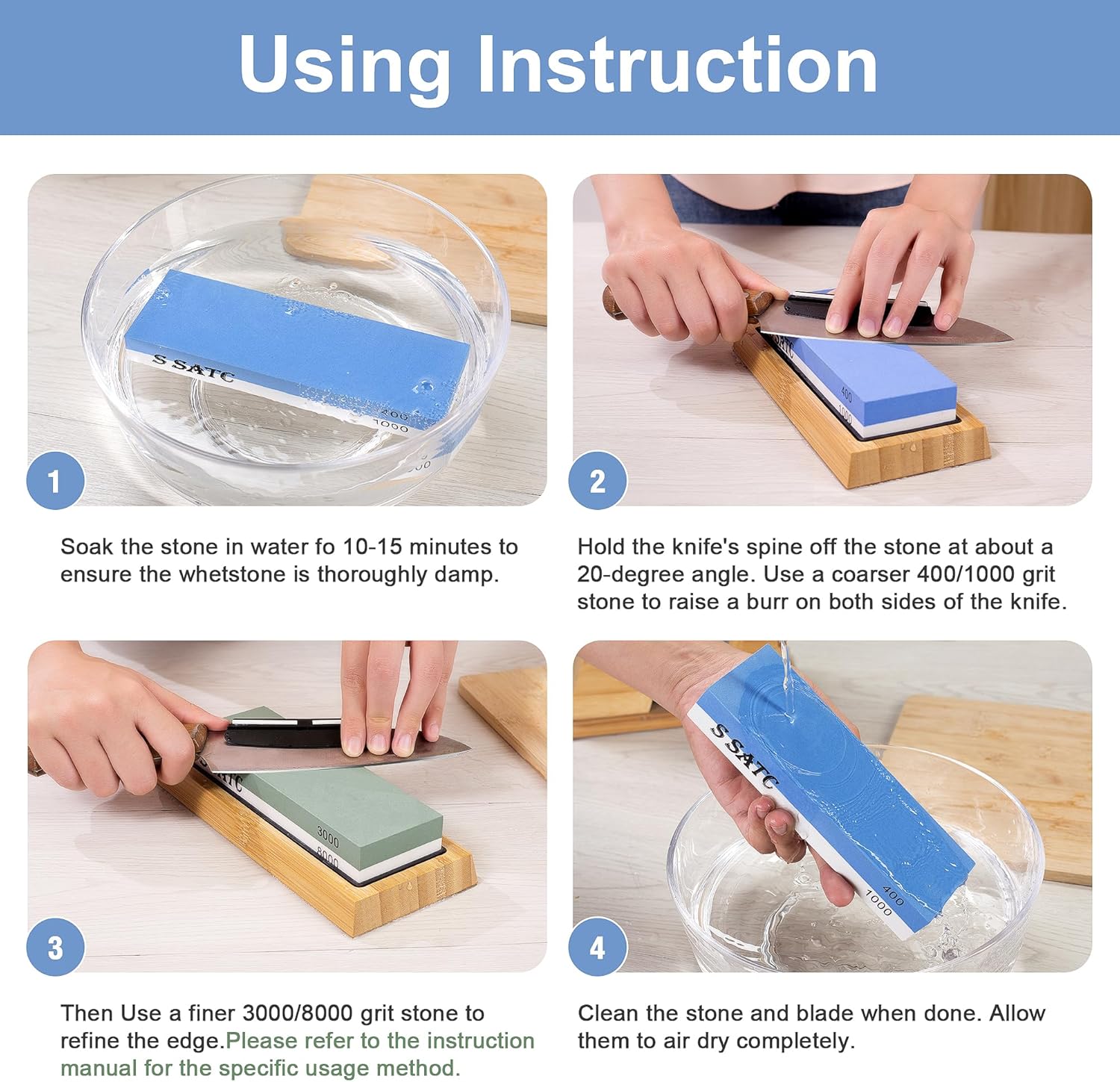 - From Coarse to Fine:knife stone sharpener features a four-sided 400/1000/3000/ 8000 design, meeting all your sharpening needs. 400 Grit: For rough grinding, fixing big gaps restore sharpness to repair damaged or chipped edges. 1000 Grit: For sharpening small edges of the knifes that are not very dull. 3000 Grit: For daily use, making the edge of most knives and tools extremely sharp. 8000 Grit: For ultra-fine finishing and refining, polishing edge to make it smooth and bright