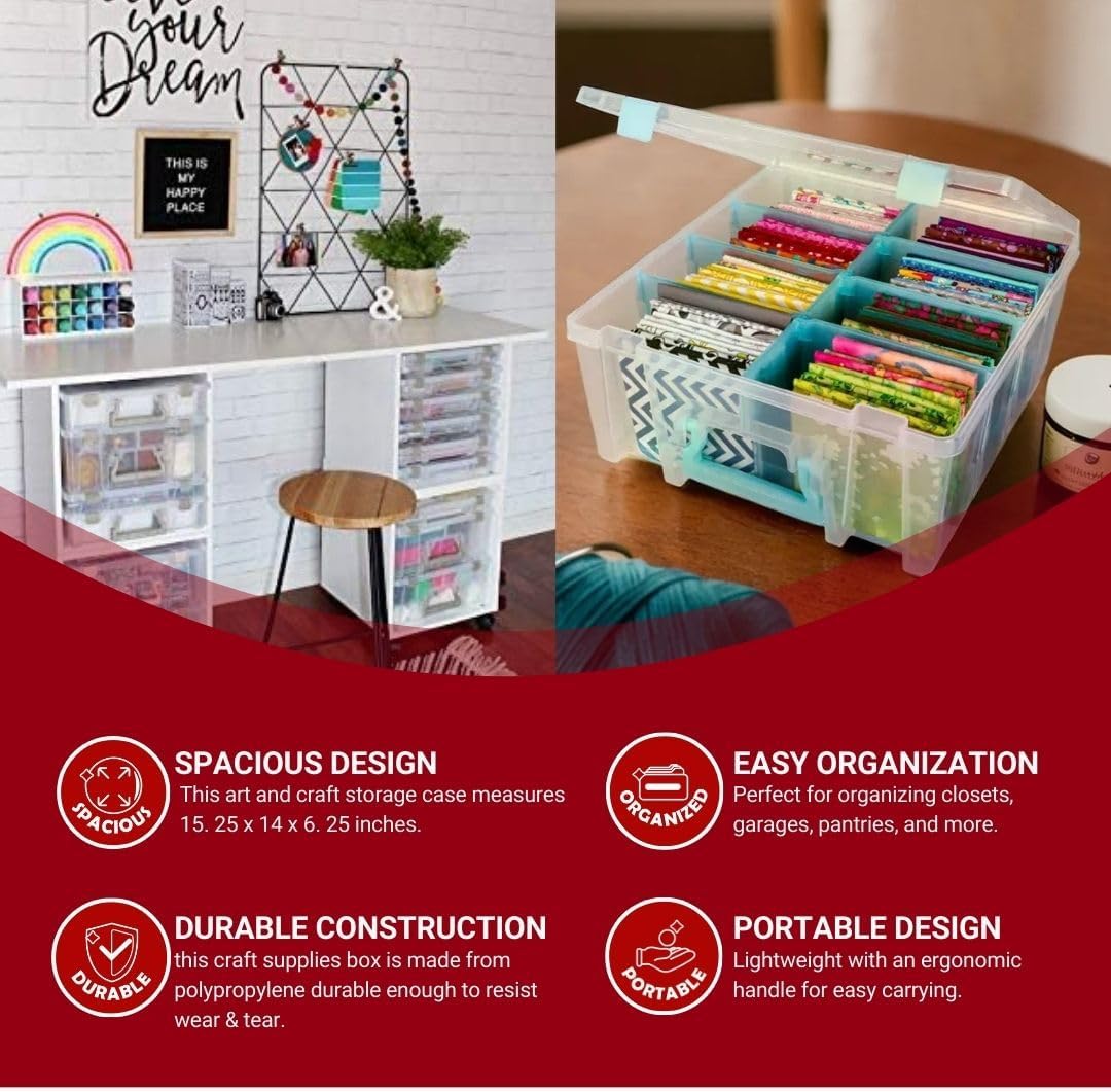 - DETAILS: This art and craft storage case measures 15. 25 x 14 x 6. 25 inches. Clear body with aqua mist-colored latches and handle. Made in the U. S. A.