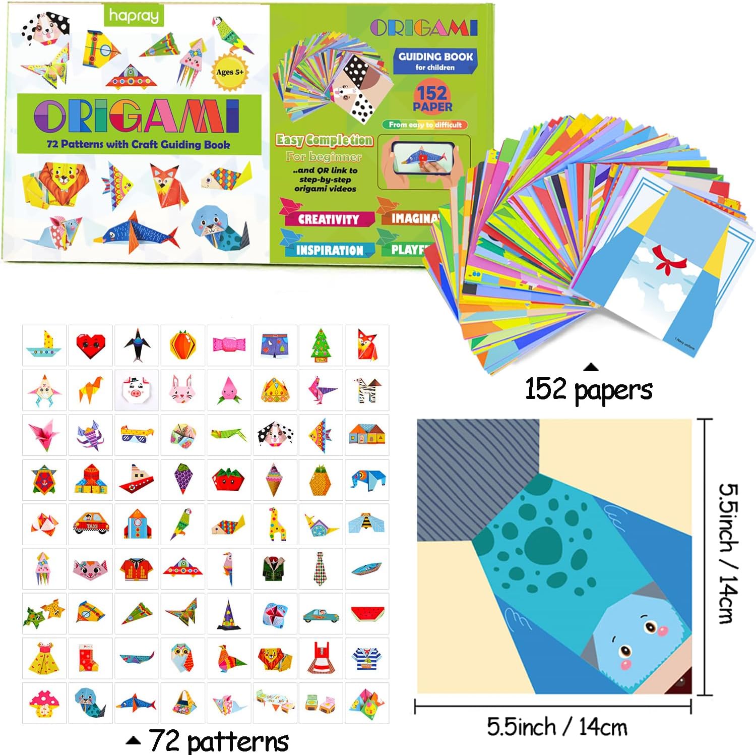 hapray Origami Kit for Kids Ages 5-8 8-12, with Guiding Book, 152 Paper with 72 Patterns, DIY Art and Craft Projects, Beginners Children's Day Gift Boy Girl
