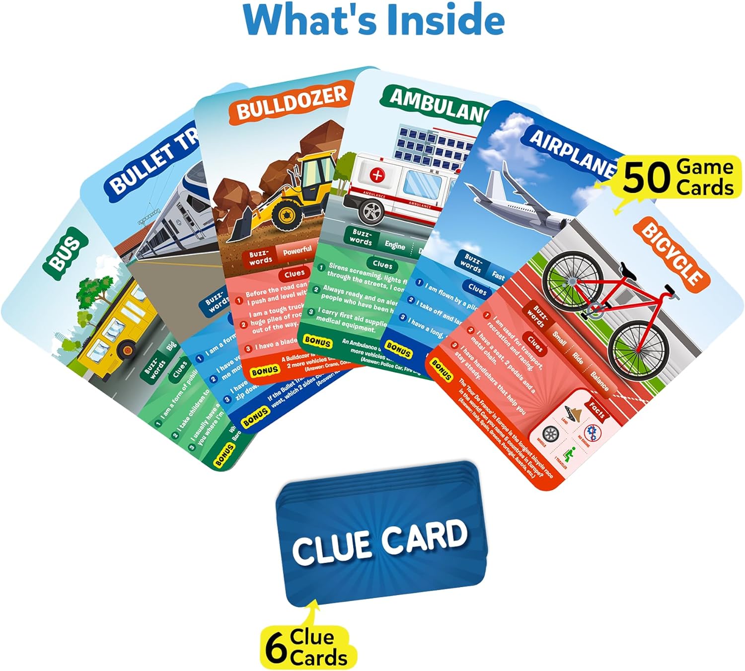 - ULTIMATE GUESSING GAME: Divide yourselves up in teams, or play one on one, ask up to 10 questions to guess the mode of transport on the Game Card! Does it have more than 2 wheels? Does it have an engine? Is it a land vehicle? Think hard, ask intelligent questions and the be the first player to win 7 Game Cards!