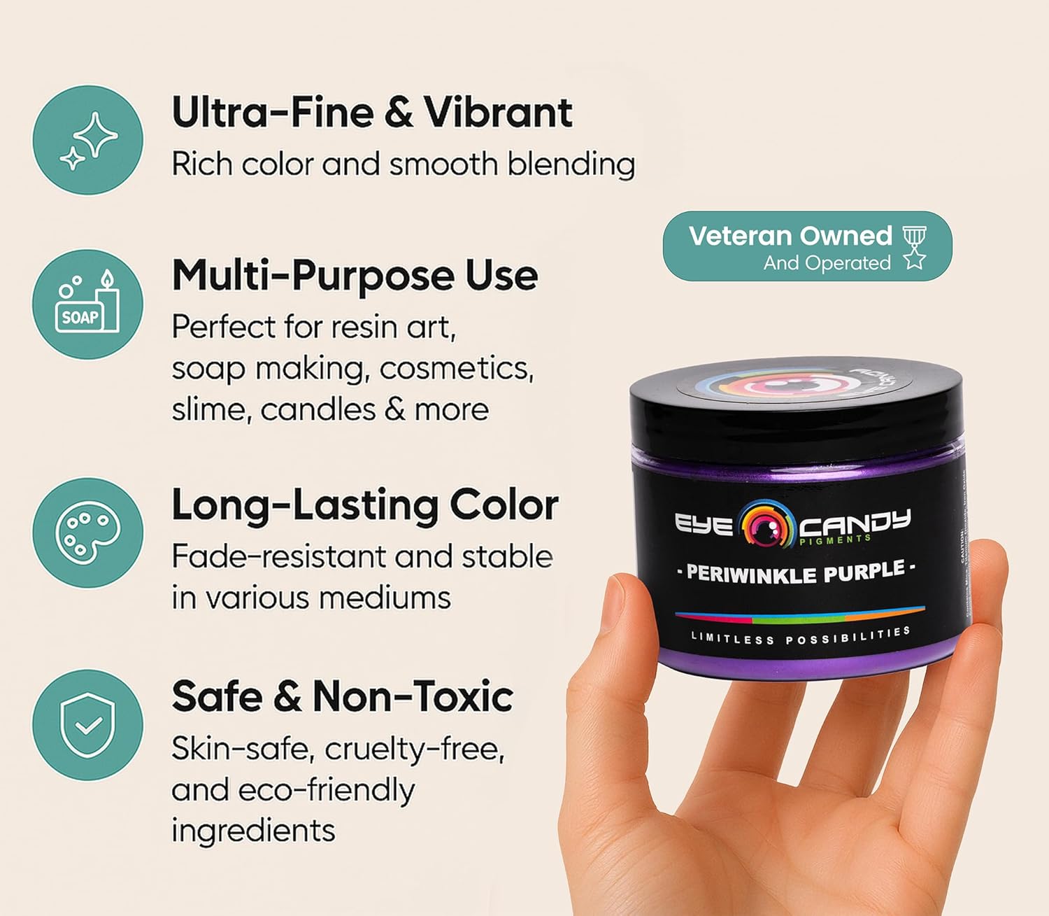 - MULTIPURPOSE PURPLE MICA POWDER – Dive into the allure of our Periwinkle Purple, a stunning shimmering purple shade that elevates every craft to the realm of elegance. Its bewitching hue promises a touch of opulence to every project. Whether you're expressing your artistry or indulging in DIY crafts, this pigment is your ultimate muse. Ideal for epoxy resin, melt & pour, plastics, acrylic painting, slime, bath bombs, jewelry, and candle making.