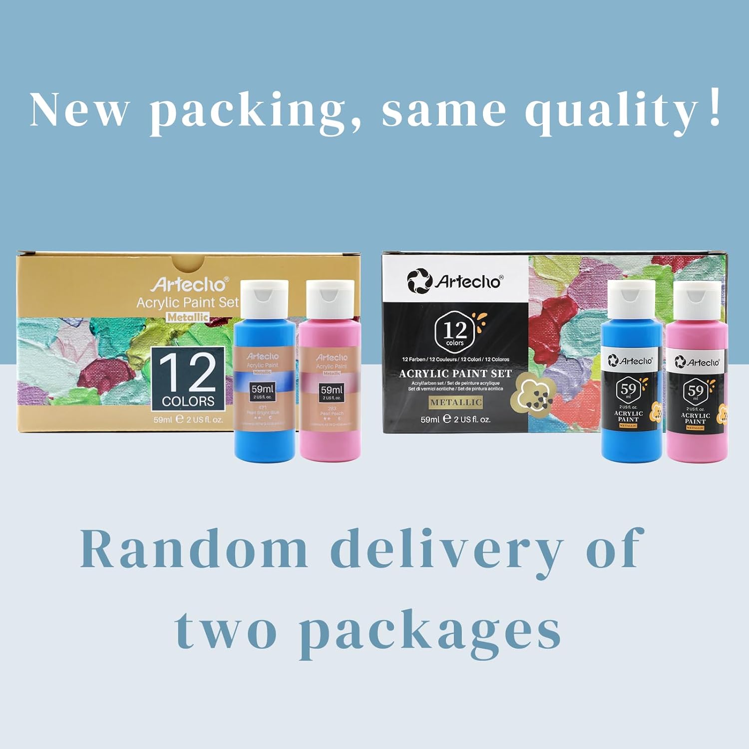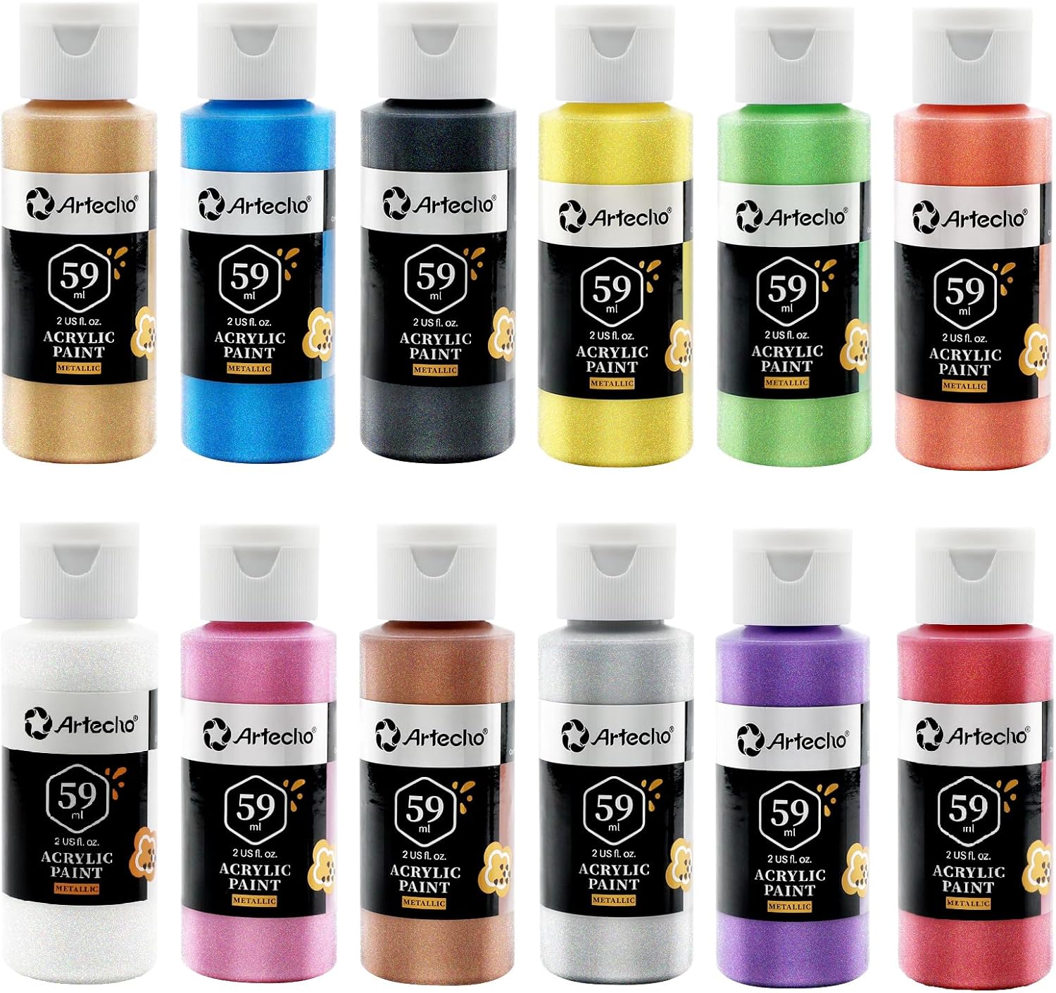 Artecho Acrylic Paint Set, 12 Metallic Colors Bottles (59ml / 2oz) Art Craft Paints for Canvas, Rock, Stone, Wood, Fabric, Art Supplies