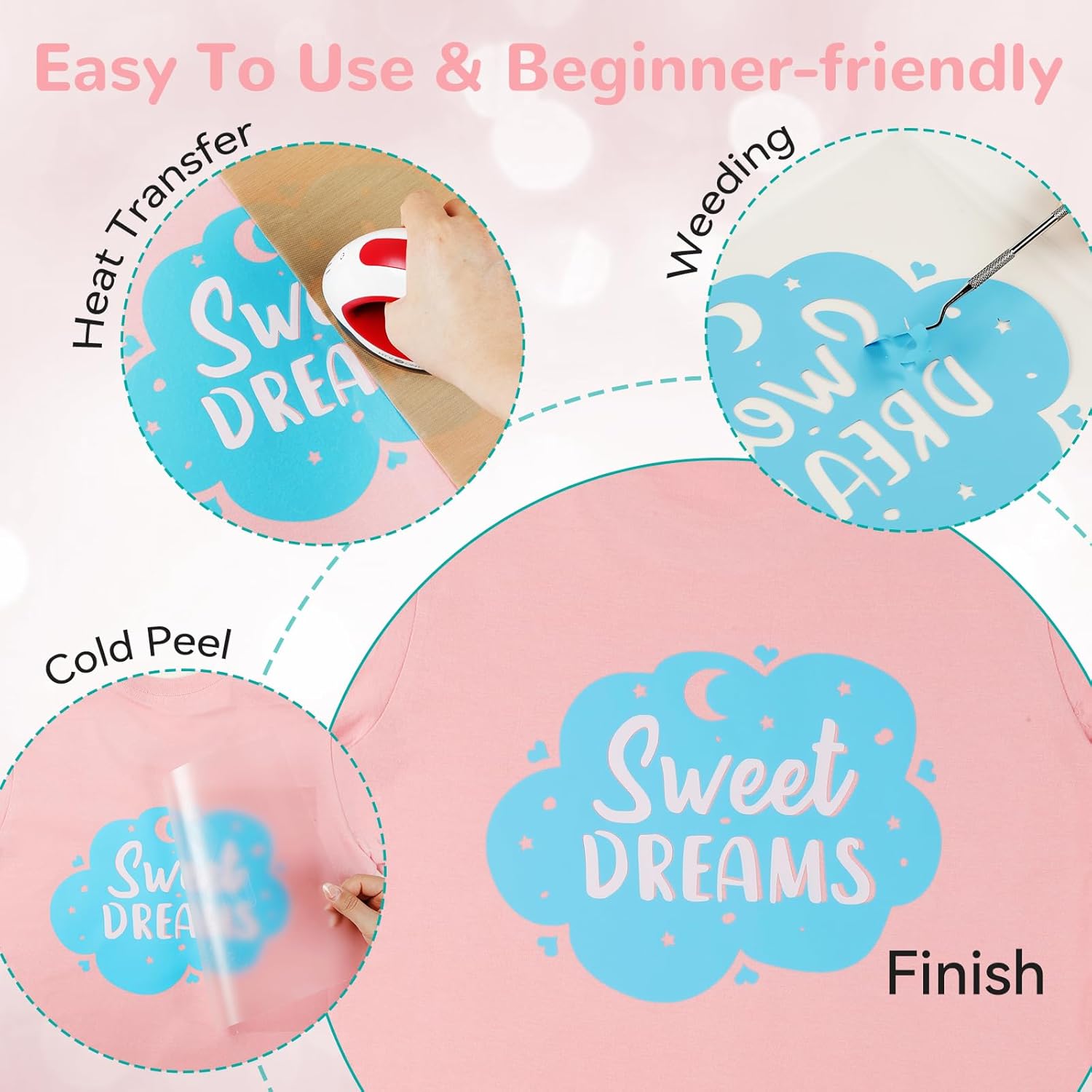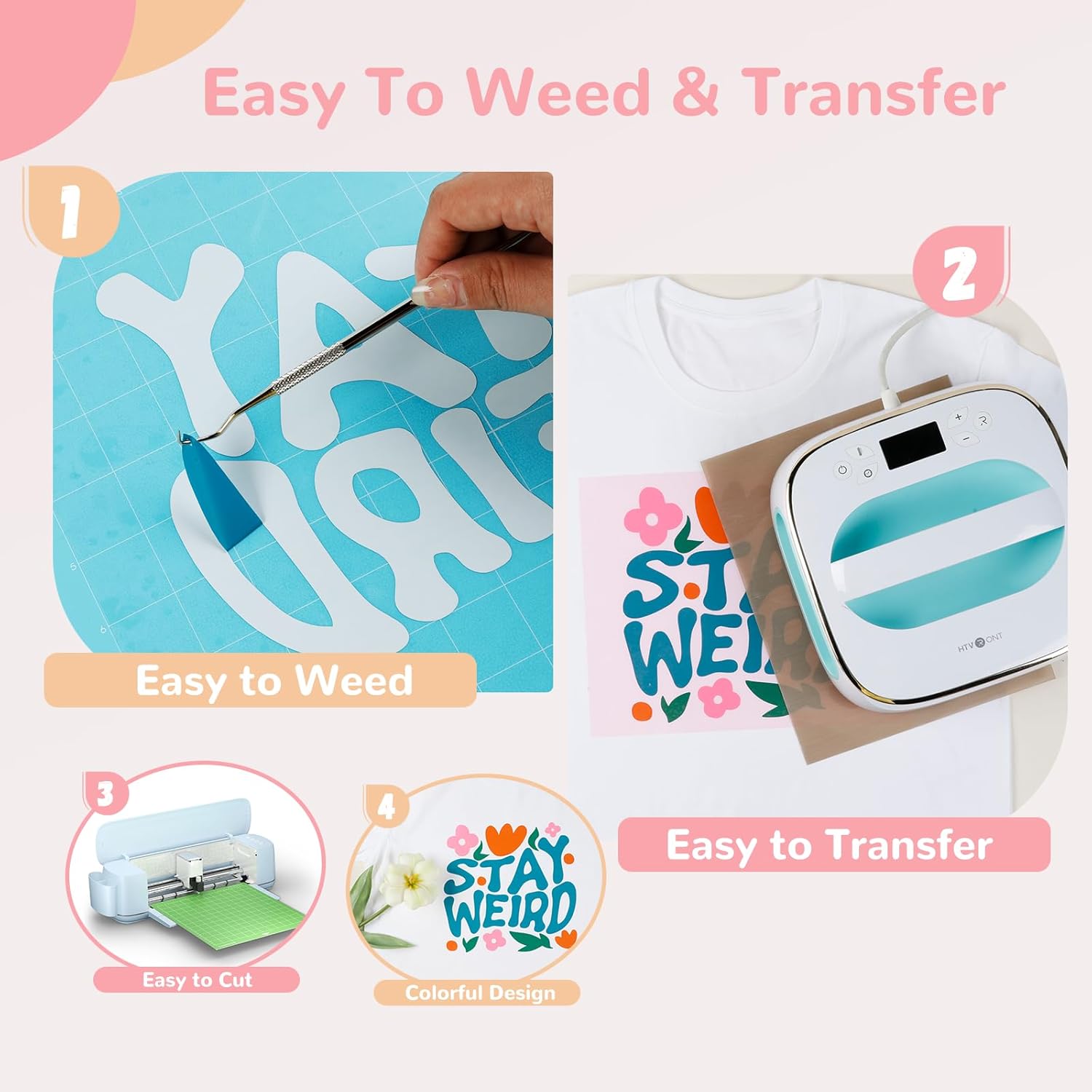 - 【EASY TO CUT & WEED & TRANSFER】The PU HTV heat transfer vinyl bundle is thin and smooth with a good cutting application characteristics, so you can cut and weed easily through the designs just right.The PU iron on vinyl is sensitive to temperature and pressure, which can be heat transferred on any t-shirt easily. HTV vinyl is COLD peel.