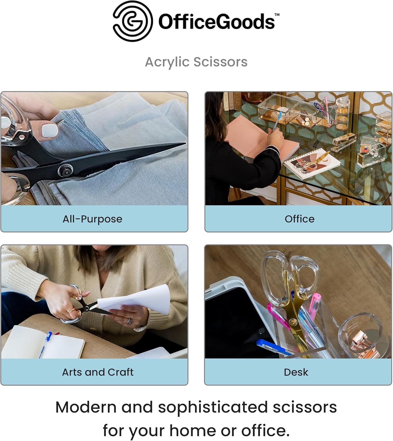 - Cut and craft with style - Cut in style with OfficeGoods Acrylic Scissors. Not just for arts and crafts, these sharp scissors for the office can also cut non-paper products, like ribbon, twine, and more.