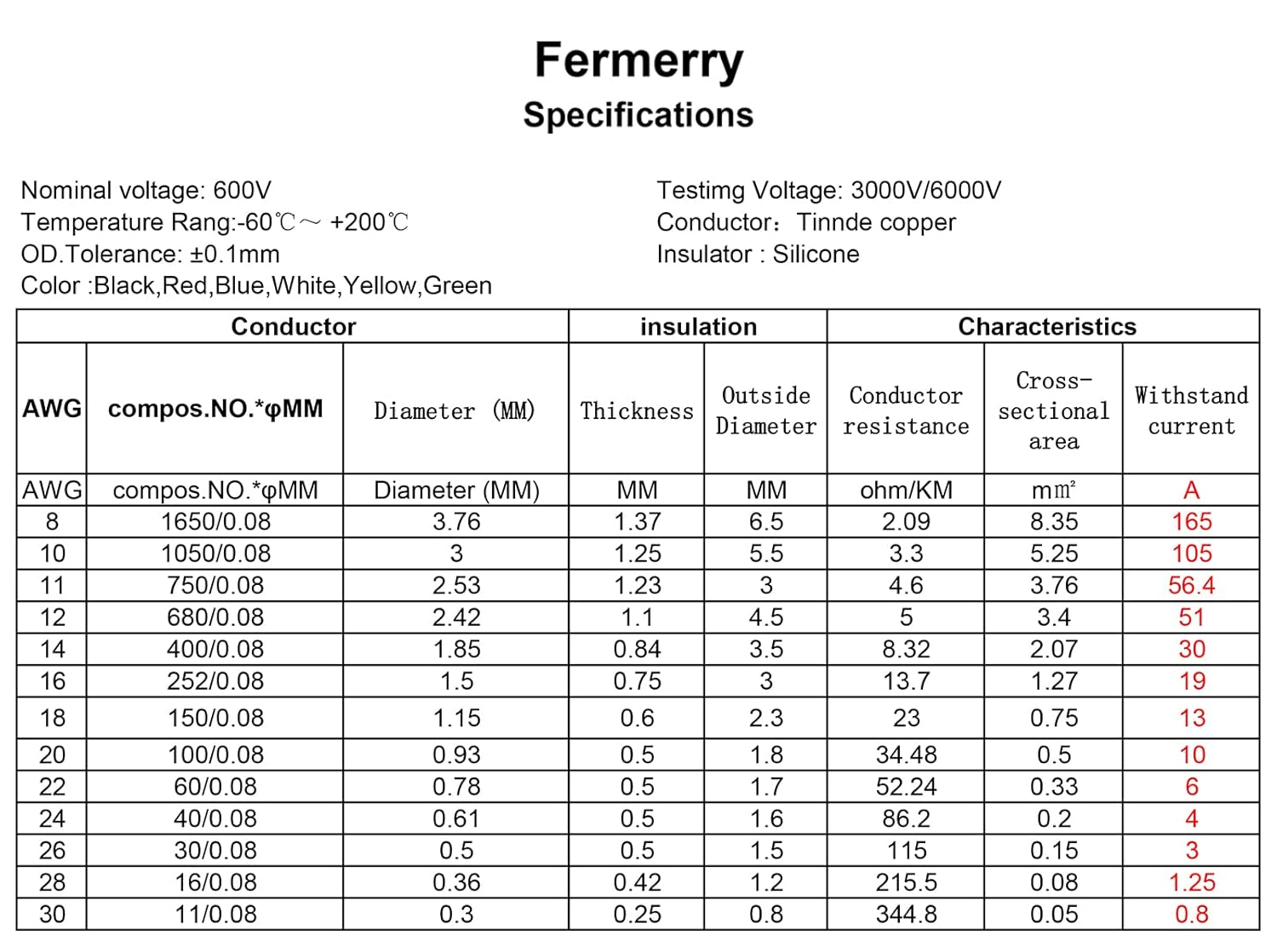 - Application-Fermerry silicone wires are widely used in LED lighting, electrical and electrical equipment, aluminum batteries, RC batteries, model wiringz harnesses, instrumentation internal connections, large transformers and motors connecting equipment with wires,etc