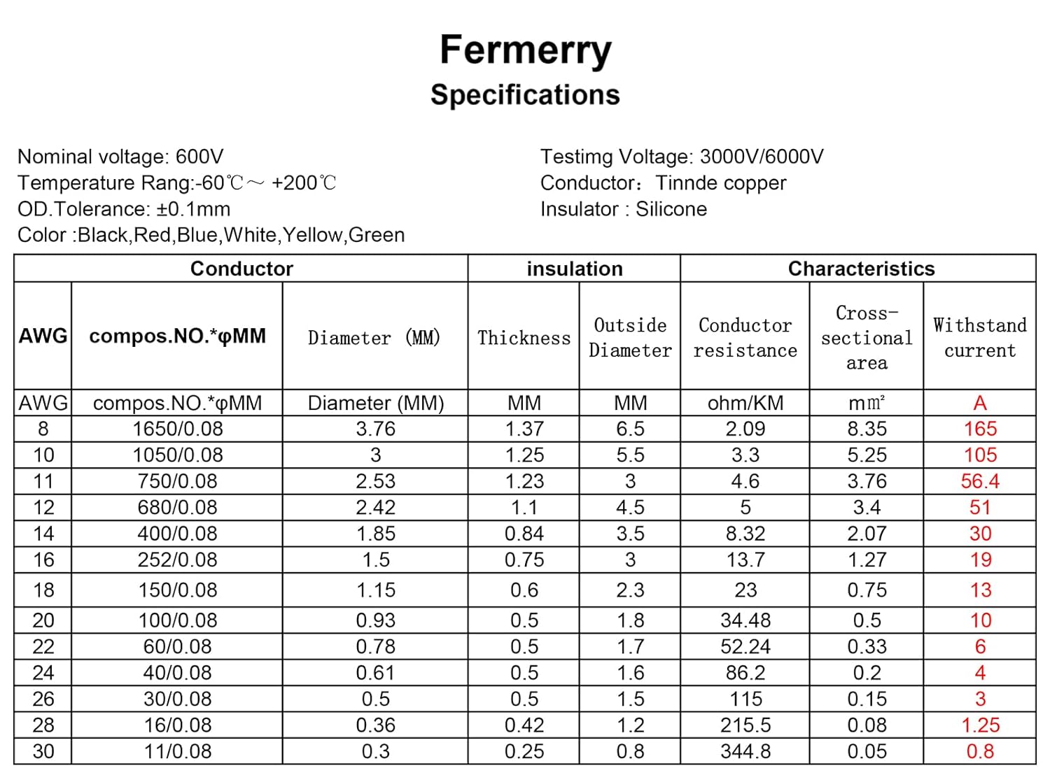 - SPECIFICATIONS -silicone Wire 20 AWG Hook-Up Wire is made of 100 strands 0.08mm silicone tinned copper conductor with a silicone sheath, withstand current 10A, OD=1.8mm; 600 volts voltage rating, Silocone Insulation that can withstand heats of up to 200 degree C.