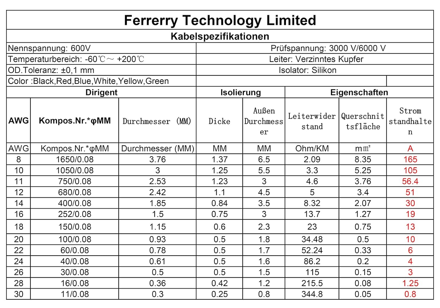 - SPECIFICATIONS -silicone Wire 22 AWG Hook-Up Wire is made of 60 strands 0.08mm silicone tinned copper conductor with a silicone sheath, withstand current 6A, OD=1.7mm; 600 volts voltage rating, Silocone Insulation that can withstand heats of up to 200 degree C.