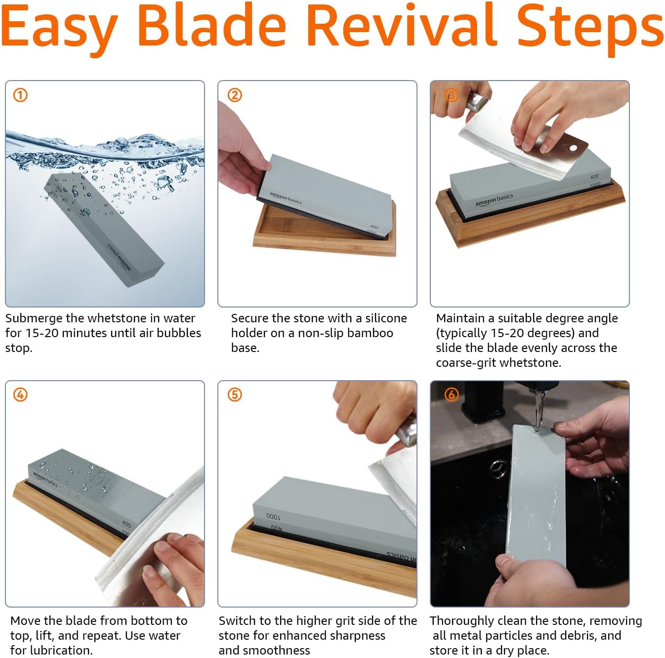 - 2 dual-sided whetstones: 400/1000 grit and 3000/8000 grit for ultimate control; stones use water (vs. oil) for sharpening; clean easily with water