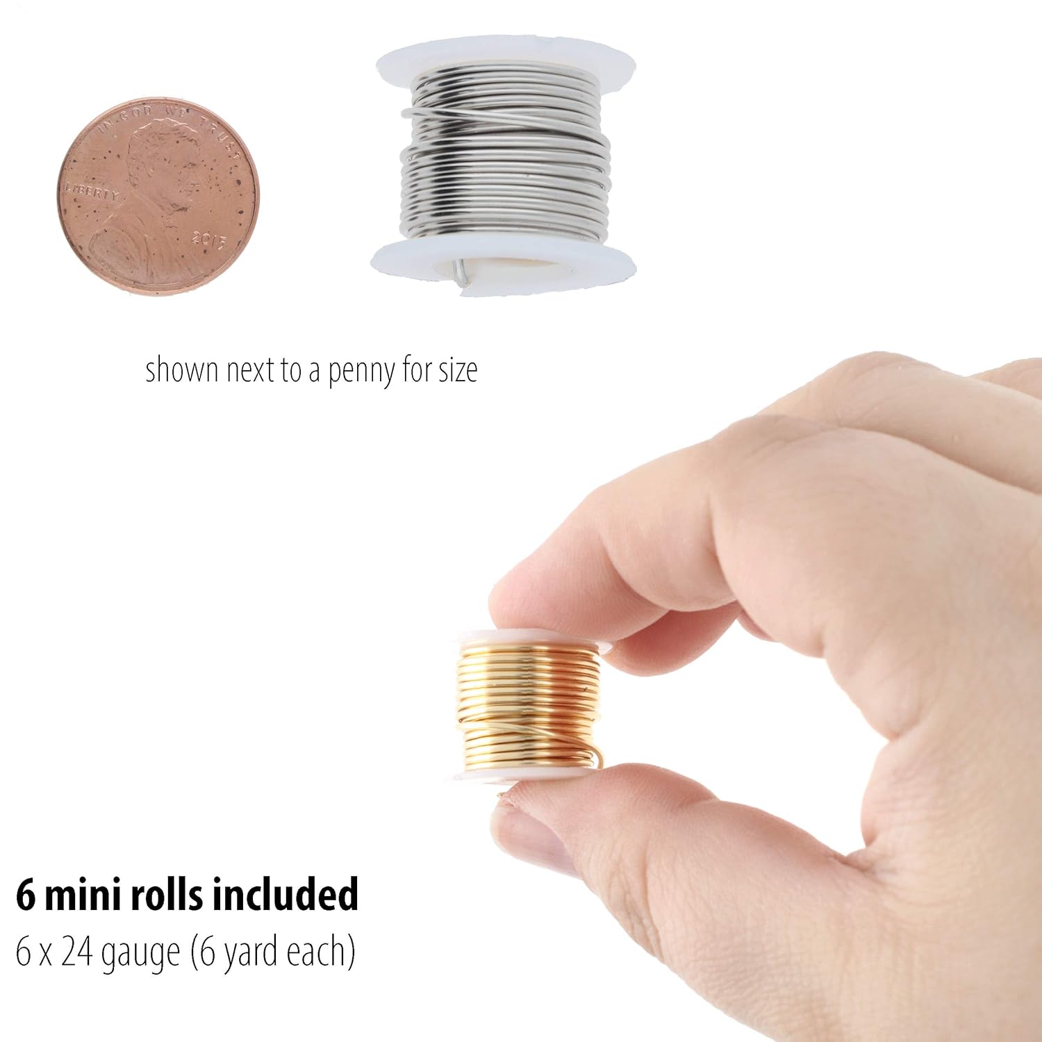 - INCLUDES: This assortment pack of medium temper wire contains six 0.75" (2 cm) mini spools, each containing 6-yards (5.5 m) length of craft wire. It includes 1 gold color, 1 silver color, 1 copper color, 1 rose gold color, 1 vintage bronze color, and 1 antique copper color. Each bobbin of wire is 24 gauge.