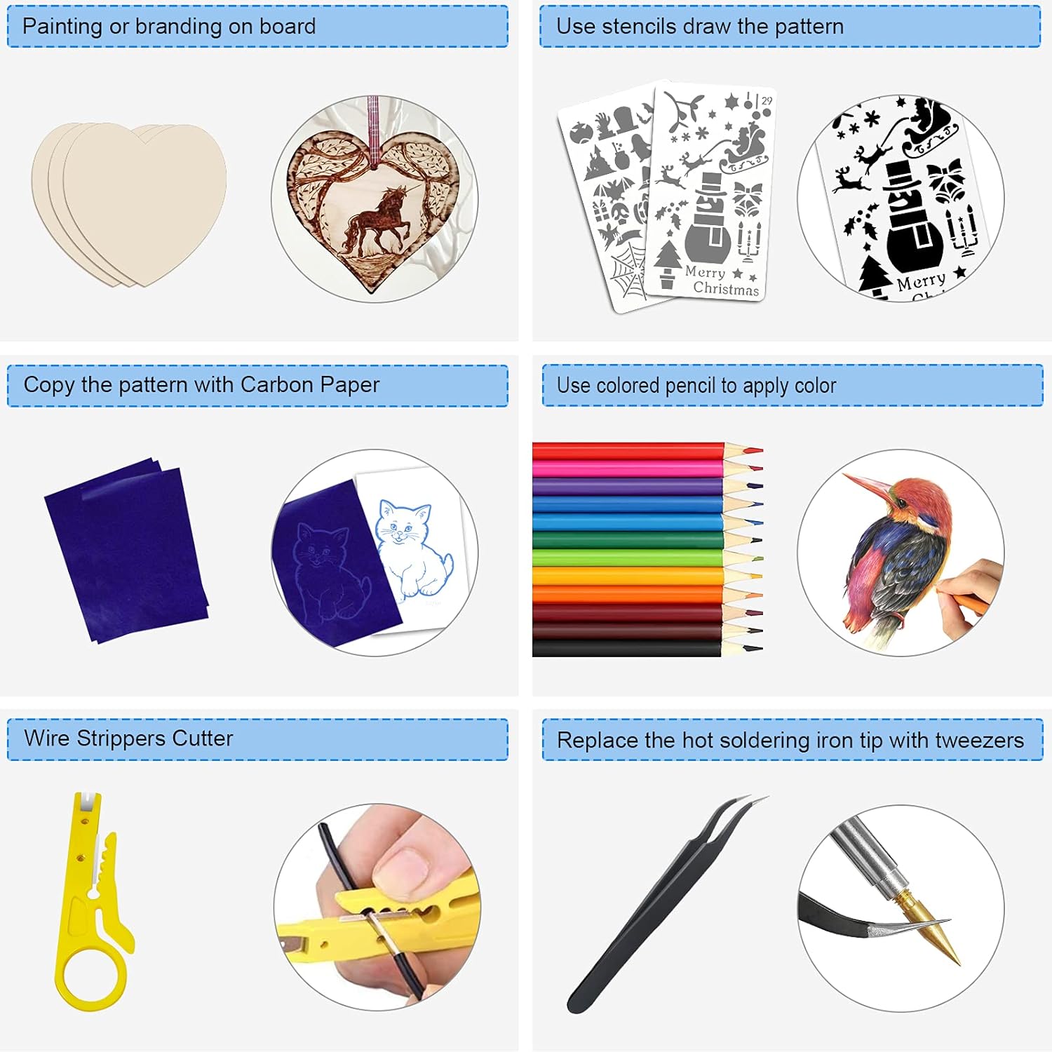 - Multifunctional Use: IVSUN 116pcs wood burning kit. Assortment of essential tools are in one box, allowing you to design on all types of wood, cut stencil, soldering, craft paper, emboss fabric, carve a variety of surfaces such as leather, wood, cork, welded circuit boards, foam, etc. This wood machine set can be used as soldering iron and Hot tool