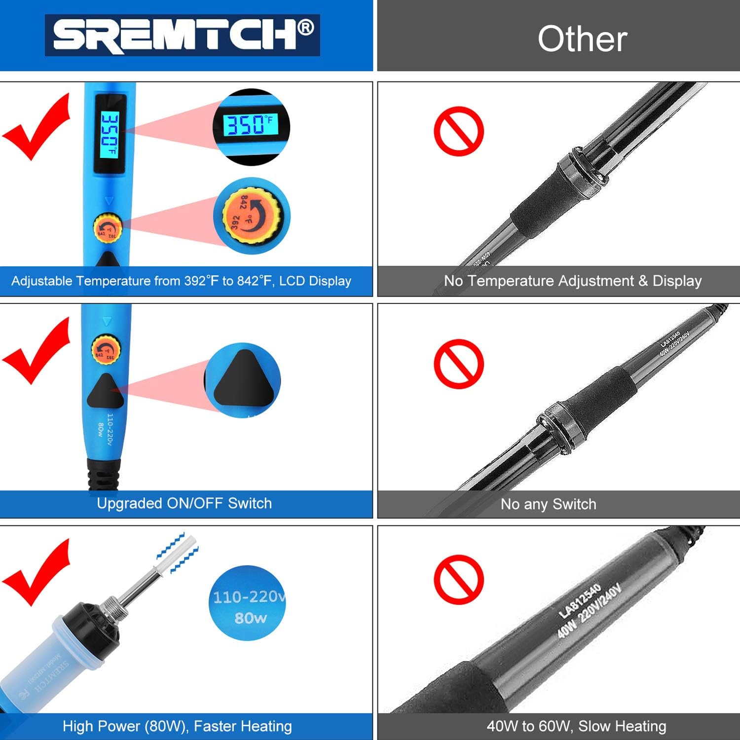 - 【Upgraded and Smarter Design】: High definition LCD screen display, the temperature status more clearly. Adjustable temperature design(from 200℃ to 450℃), adjust the temperature according to your need by the knob wheel on the electronic soldering iron. On/Off button and working indicator light, can be freely and easily open,close and operate.For Safety,We recommend an optimal use temperature of 400 degrees Celsius