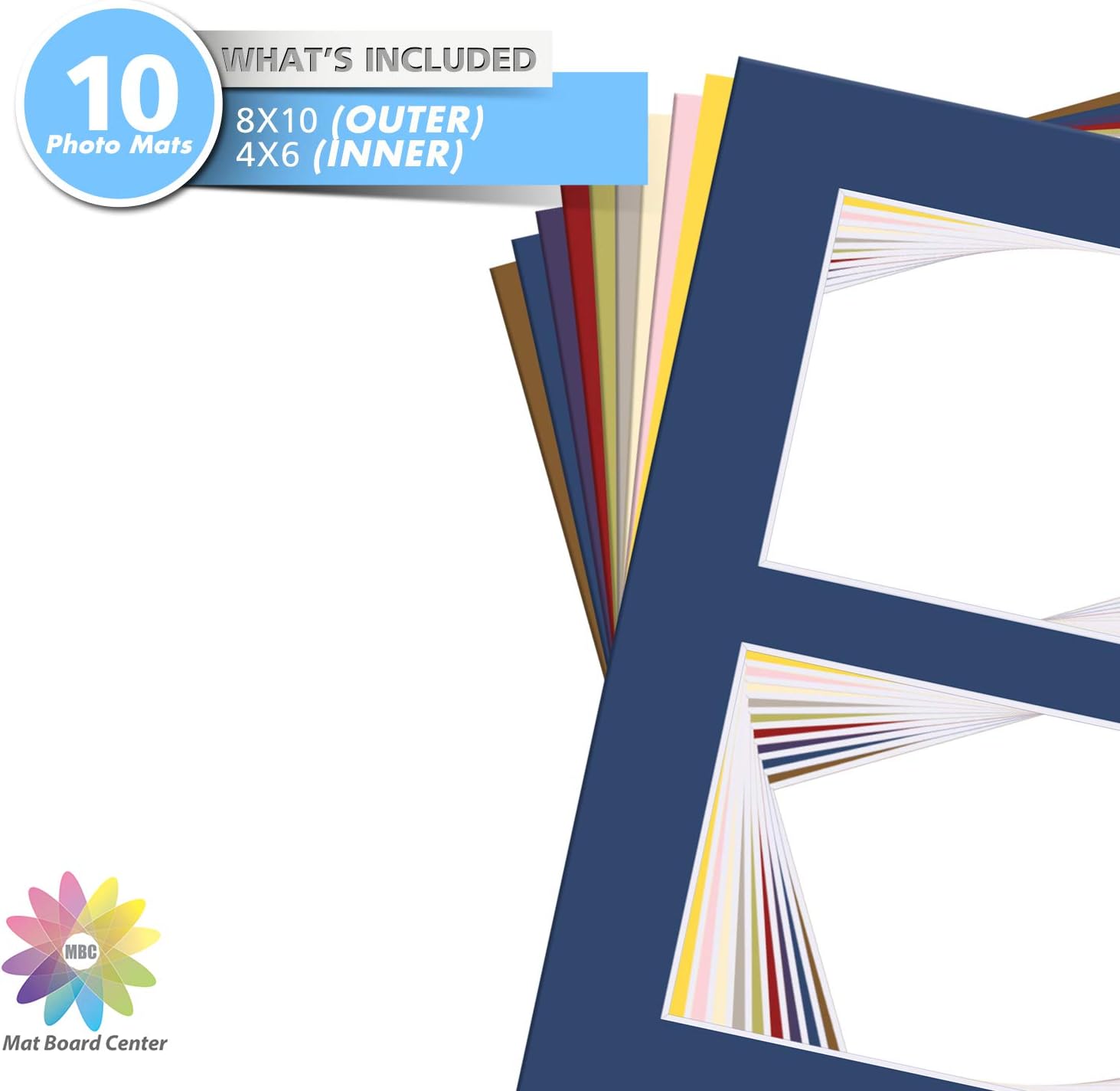 Mat Board Center, Pack of 10, Photo Picture Mats - Acid Free, 4-ply Thickness, White Core - for Pictures, Photos, Framing (8x10 for 2-4x6 Mixed Color)
