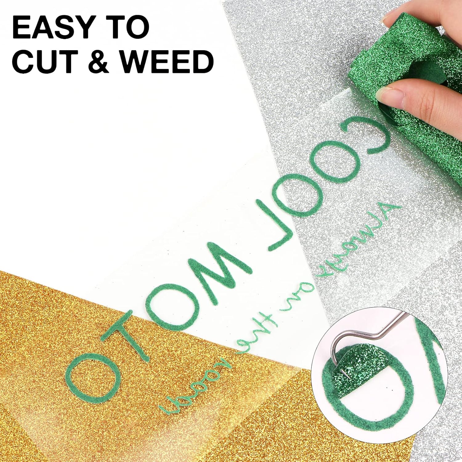- ✂ EASY TO CUT & WEED & TRANSFER ✂ The glitter htv is thick with an excellent cutting application characteristics, any cutters’ blade can cut it through easily. The medium tack transfer film makes weeding like a dream, the glitter heat transfer vinyl is extremely sensitive to heat and pressure makes transfer quickly, which you will save your time. The glitter iron on vinyl is sensitive to temperature and pressure, which can be heat transferred on any t-shirt easily.