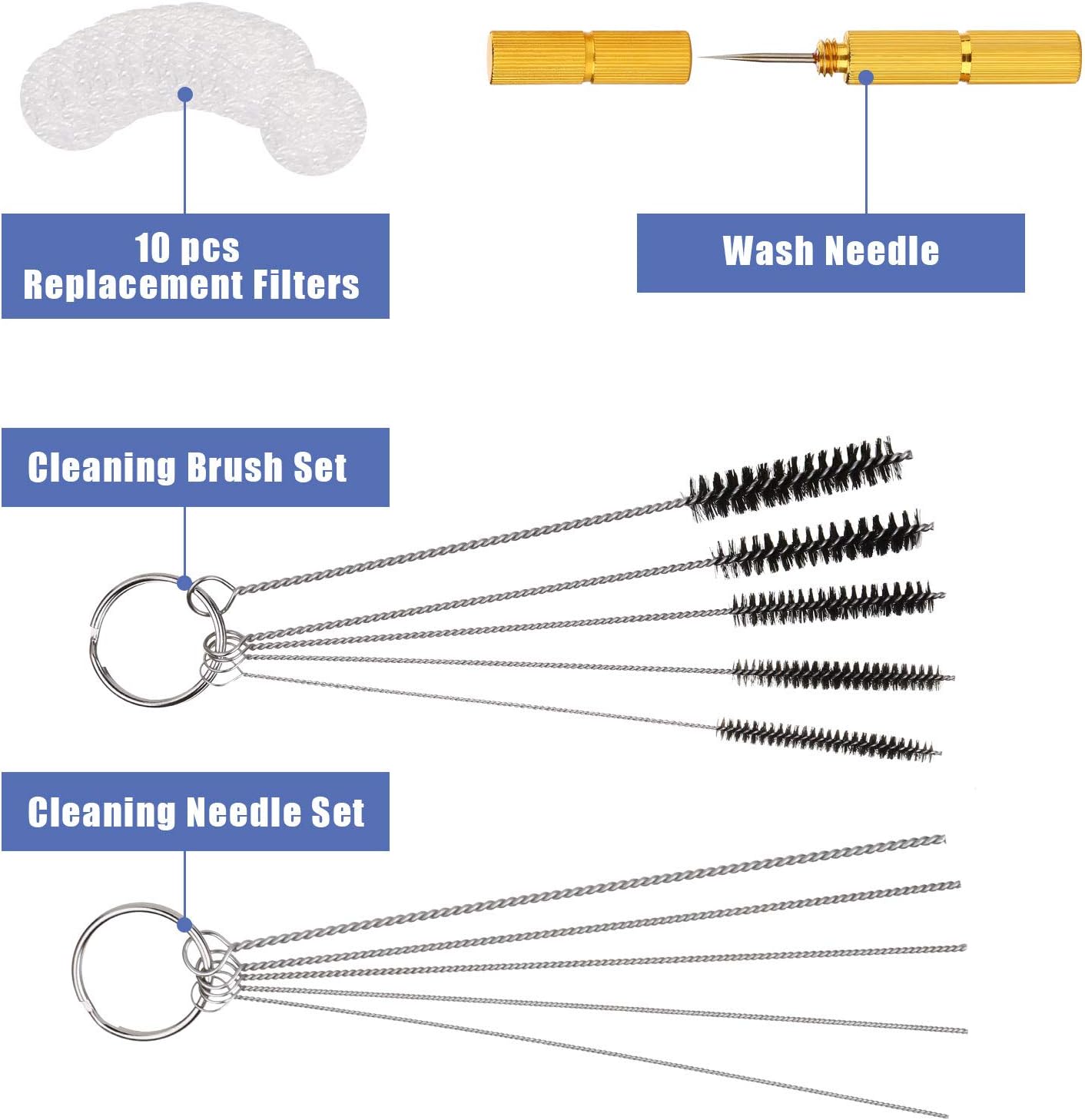 - β¦ COMPLETE SET: The airbrush cleaning kit includes everything you need for cleaning your airbrushes. They are 1 * glass airbrush cleaning pot, 1 * airbrush holder, 10 * airbrush filters, 1 * nylon tube brushes(set), 1 * stainless steel cleaning scraper needle(set), 1 * golden color nozzle wash repair cleaning needle.