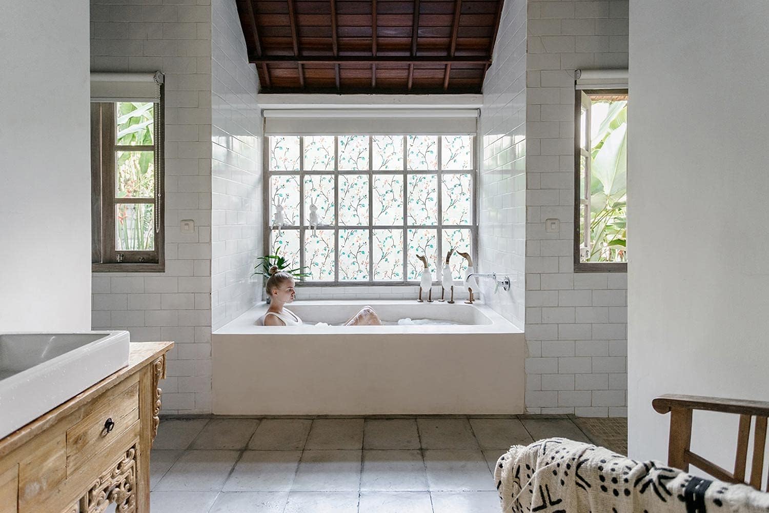 VSUDO Static Cling Decorative Window Privacy Film – Frosted Privacy Window Film with Jasmine Floral & Stained Glass Design, Adhesive-Free Tint for Home, Bathroom & Office (23.6" x 118.1")