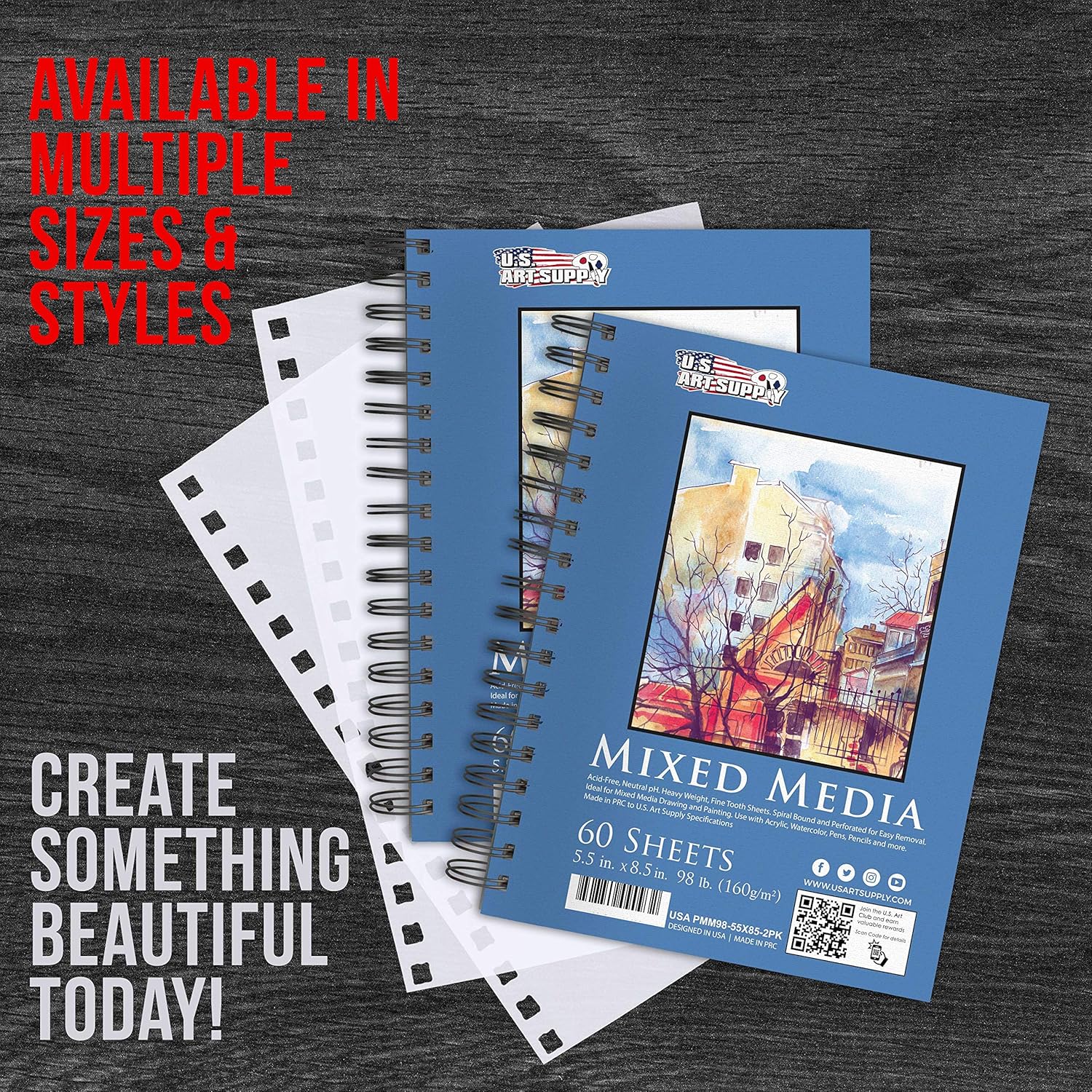 U.S. Art Supply 5.5"x8.5" Mixed Media Sketchbook, 2 Pack (60 Sheets), 98 lb (160 GSM) - Spiral-Bound Pad with Perforated Acid-Free Paper - Artist Sketch Book for Drawing, Painting, Watercolor