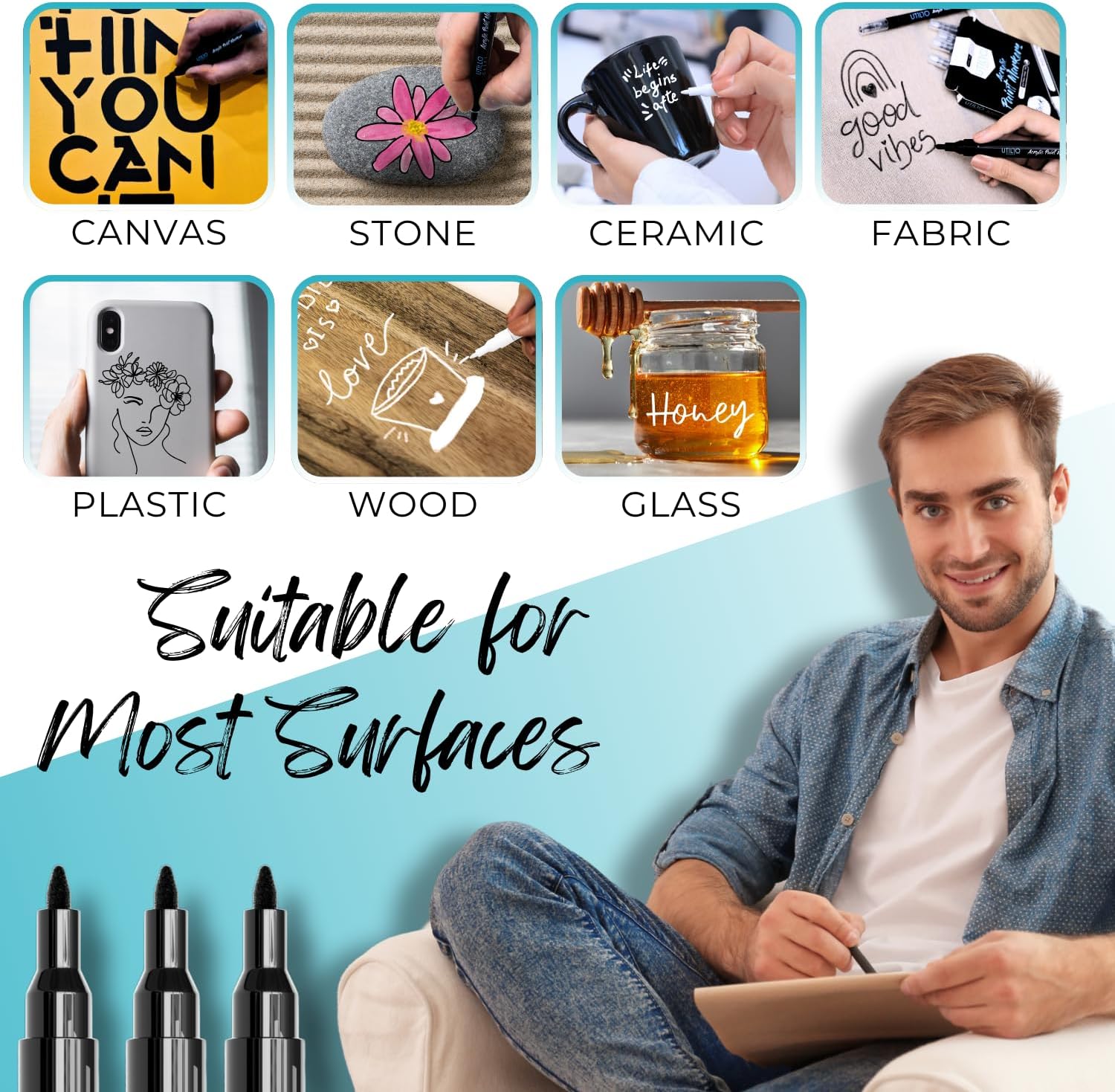 - ☑️ PAINT ON ANYTHING - Use our black paint pens on stone, wood, glass, fabric, pottery, plastic, canvas, leather, cardboard, construction paper, ceramic, metal, cement, canvas, rubber, cloth, leather, terra-cotta, chalkboards--pretty much anything you can imagine!